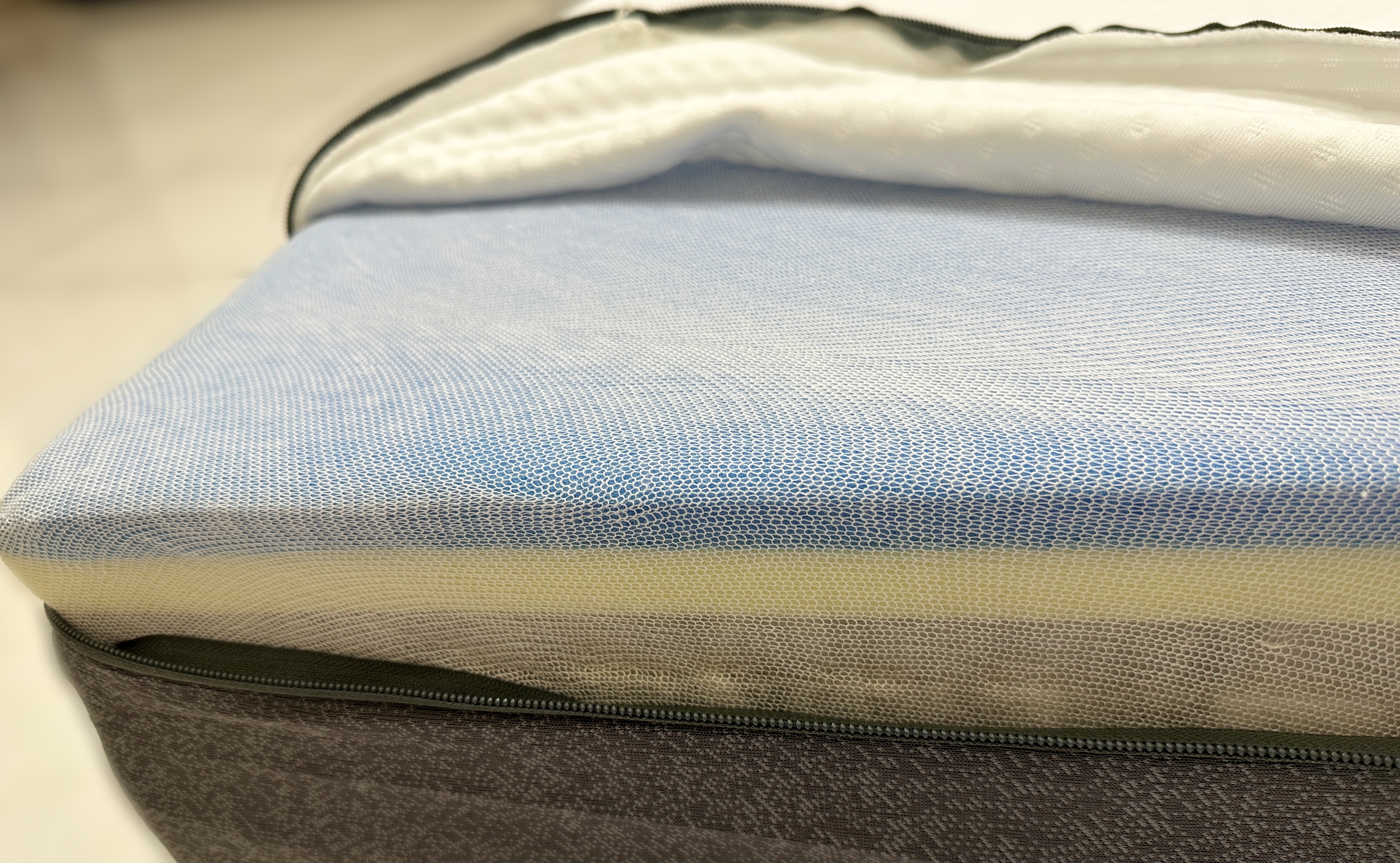 另外讓我們感到印象深刻的是:最上層的表布有縫入一層 1 公分厚的乳膠,這種特殊躺感我們覺得很少見,可能是因為大部分的廠商都將乳膠作為床墊中間或較下層的材料。