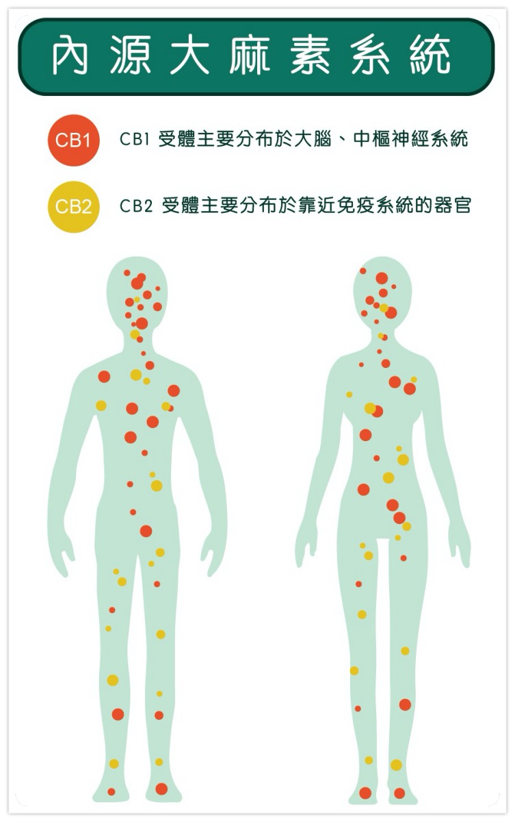 它散佈在人體的中樞神經系統,以及體內其他多處,掌管我們的內分泌、情緒、睡眠、血壓、免疫力等機制,而 CBD 可以有效的促進我們體內的內源麻素系統平衡。