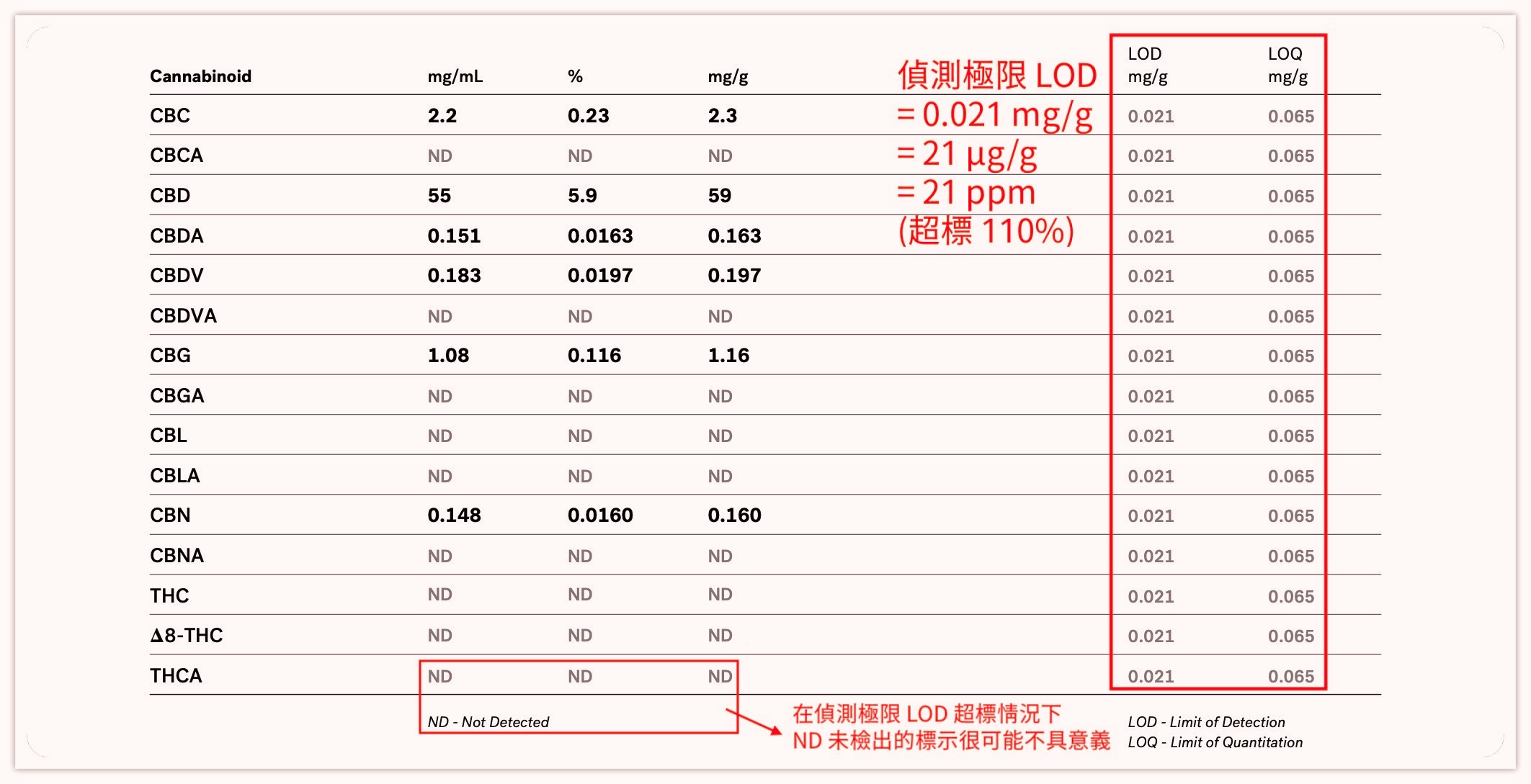 偵測極限與定量極限過高的檢驗報告截圖;就算標示 ND 未檢出也很可能因實際成分超標而觸犯重罪