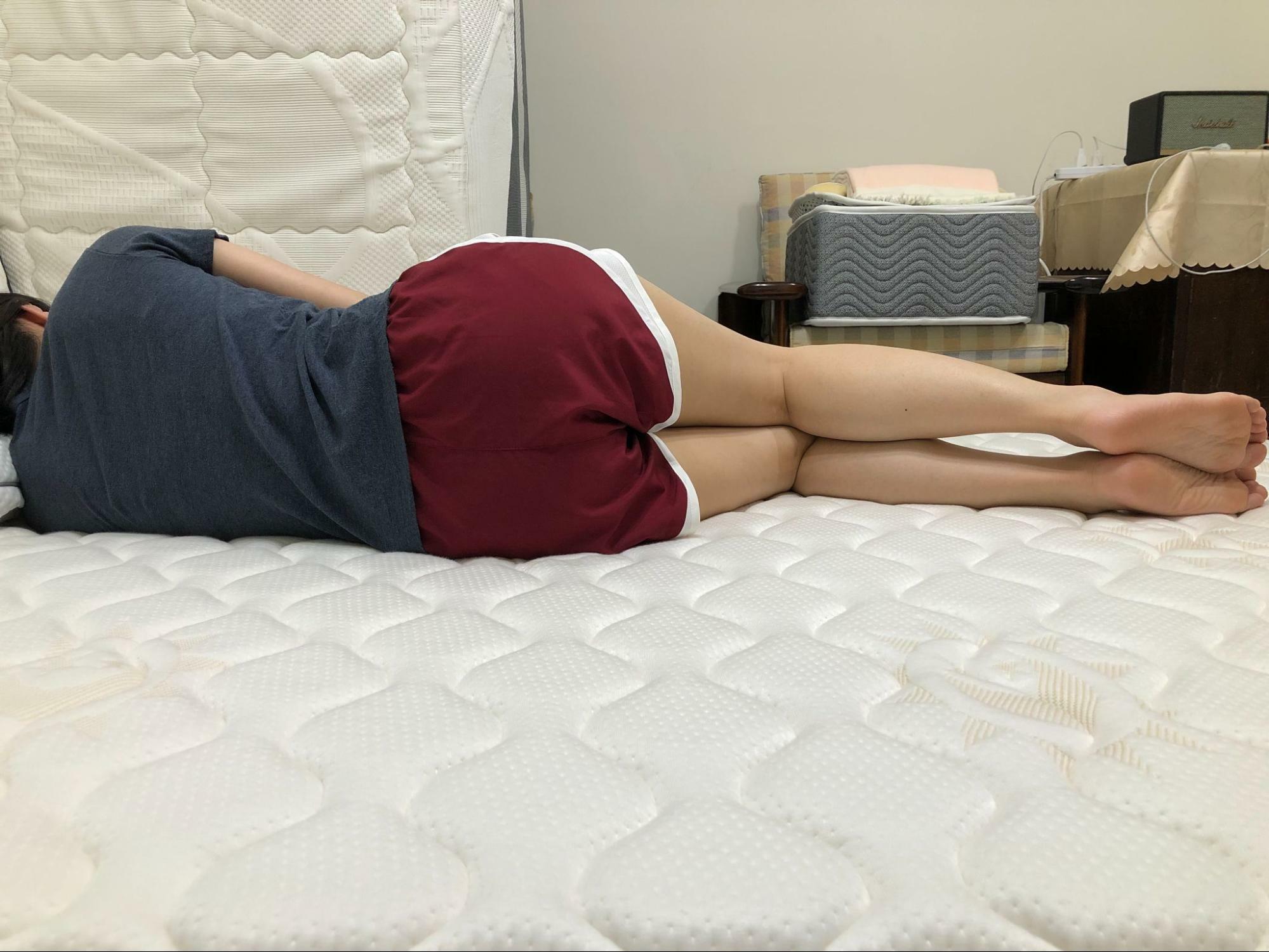 此張床墊擁有良好的支撐力,當我此張床墊上換成側躺時,手臂、肩膀還是能夠獲得床墊的支撐力,不會下陷;腰部凹陷處也能貼合床墊,不需要額外出力,可以穩穩的躺在床墊上。
