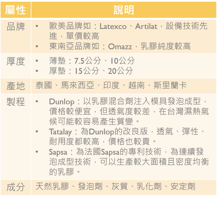 由於一般消費者較難判斷乳膠品質的好壞,比起以產地或天然與否作為判斷依據,悅夢認為指名大廠生產的乳膠是更保險的作法。