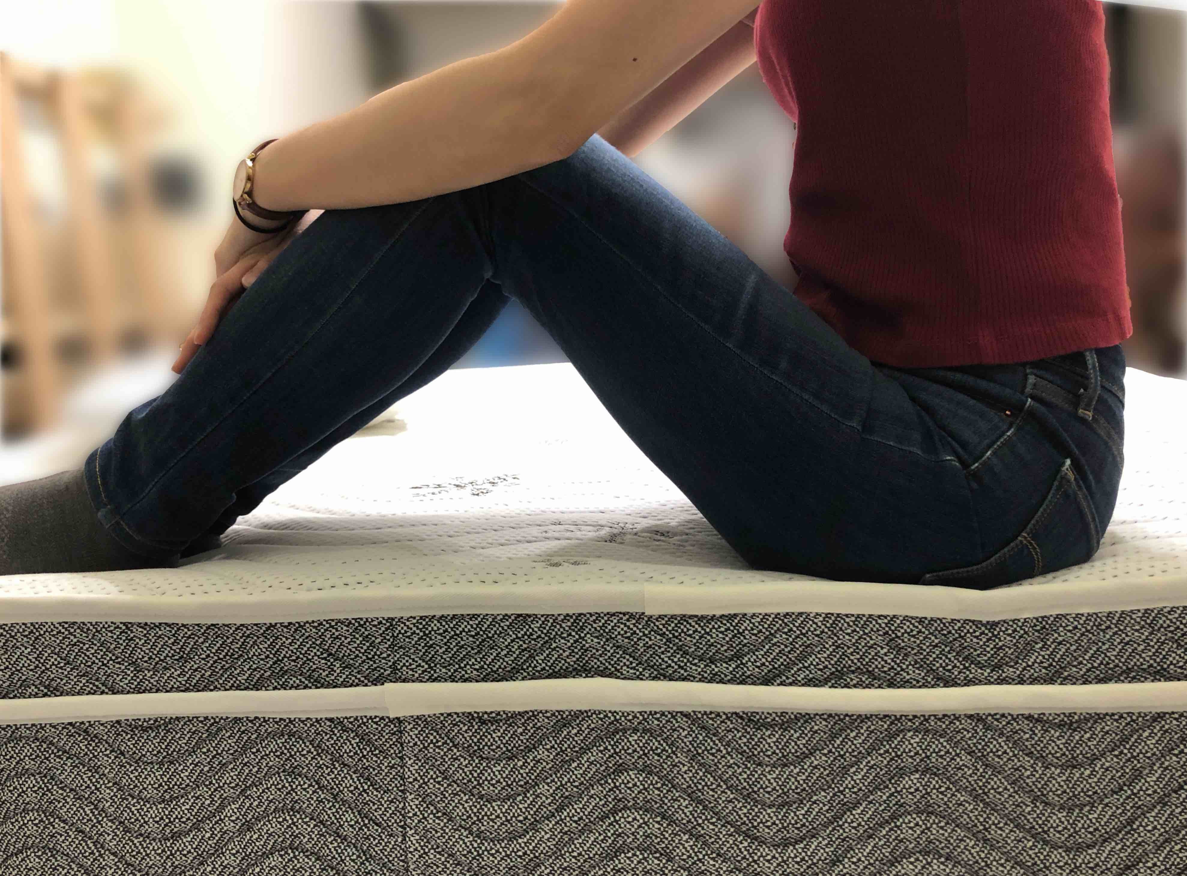 米蘭床墊反面硬度硬,整個表面都有很扎實的支撐力,可以看到當 Gin 坐在邊緣時,床墊幾乎沒有凹陷。