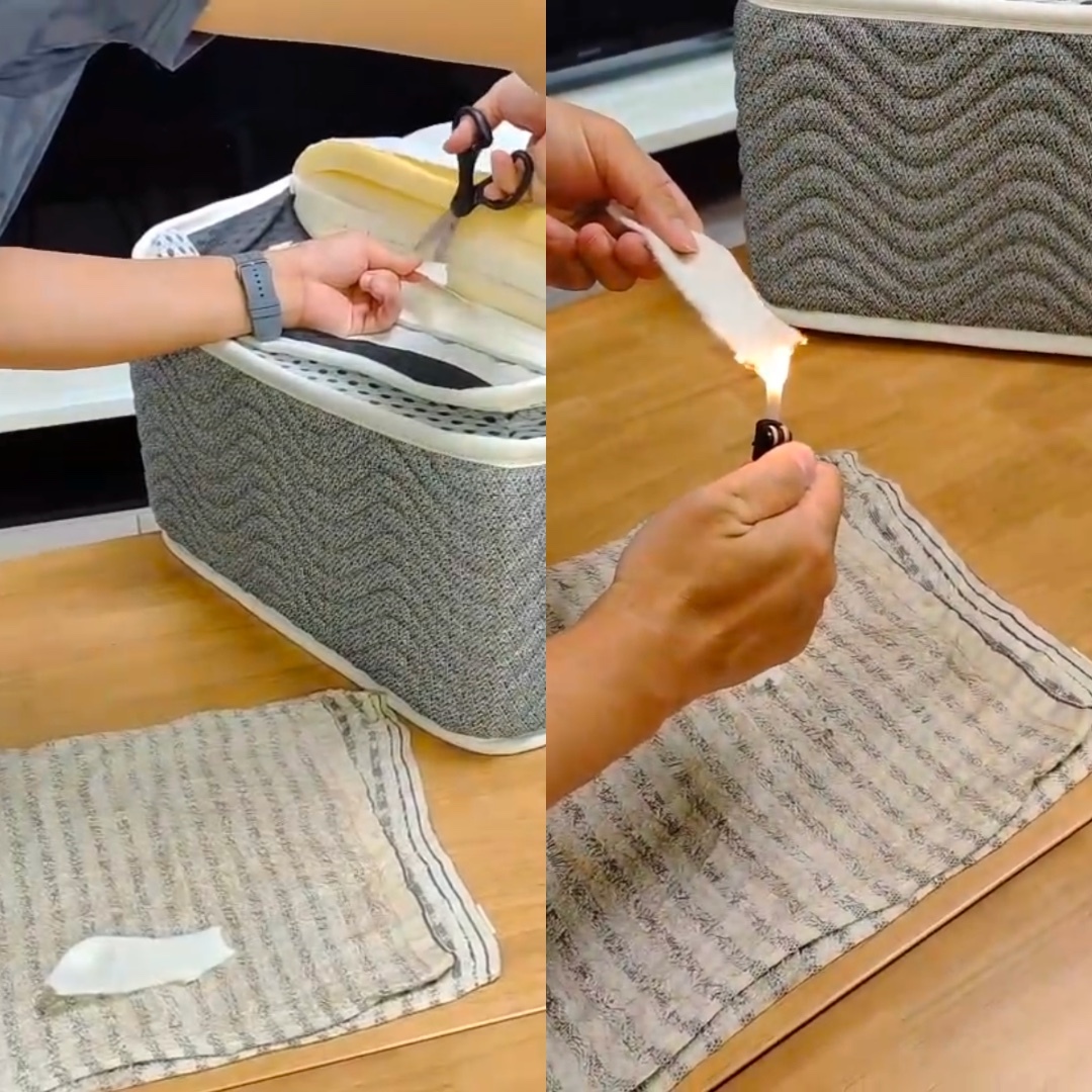 在測試的環境實際將布料用打火機「明火」直接燃燒,只能燒出零星火焰,並且很快就會自行熄滅。