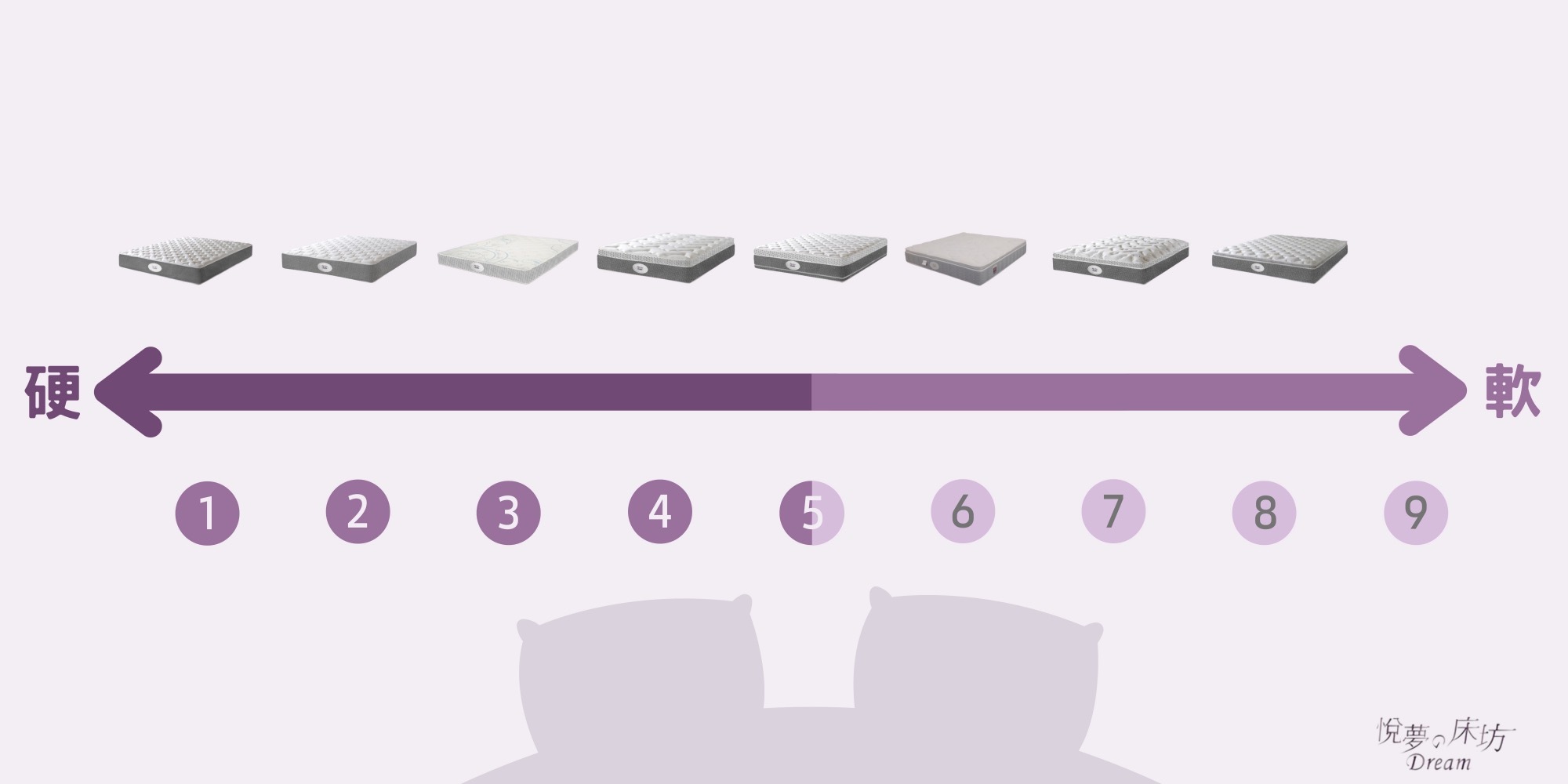 悅夢床坊的床墊軟硬度分級可以說是本土床墊品牌中最細的,共有 9 種軟硬度可供消費者選擇。