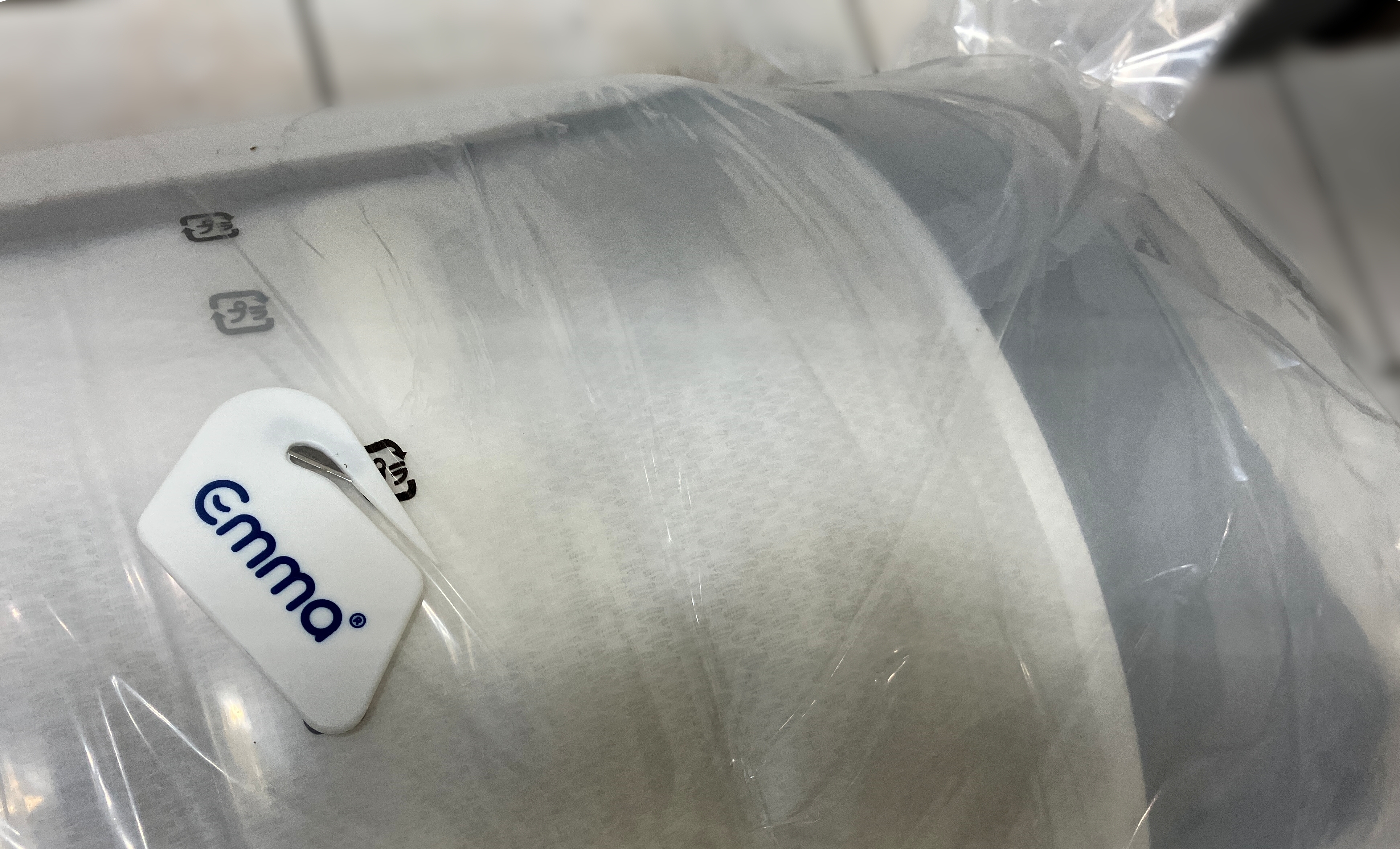 開箱後,可以看到 Emma hybrid 在真空壓縮並捲起來的情況下,體積比一般床墊小滿多的,看起來跟冬天捲起來的棉被差不多。