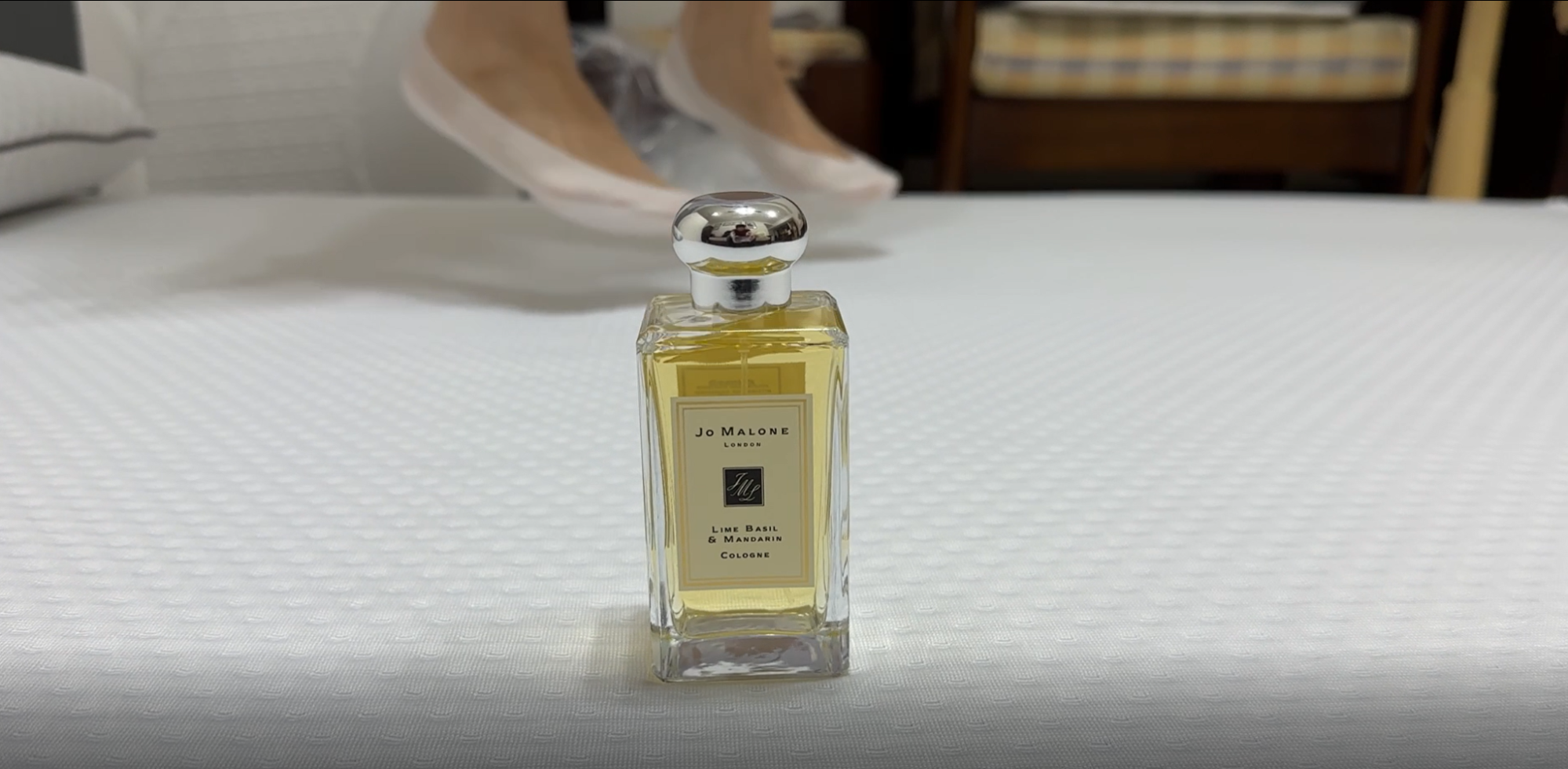 我覺得這張床墊的抗干擾性表現很好,在正常距離下來回踩踏床面,放在床上的香水液體表面只有非常輕微的晃動,直到在床墊上刻意用力跳躍時,香水表面才有出現比較大的搖動。