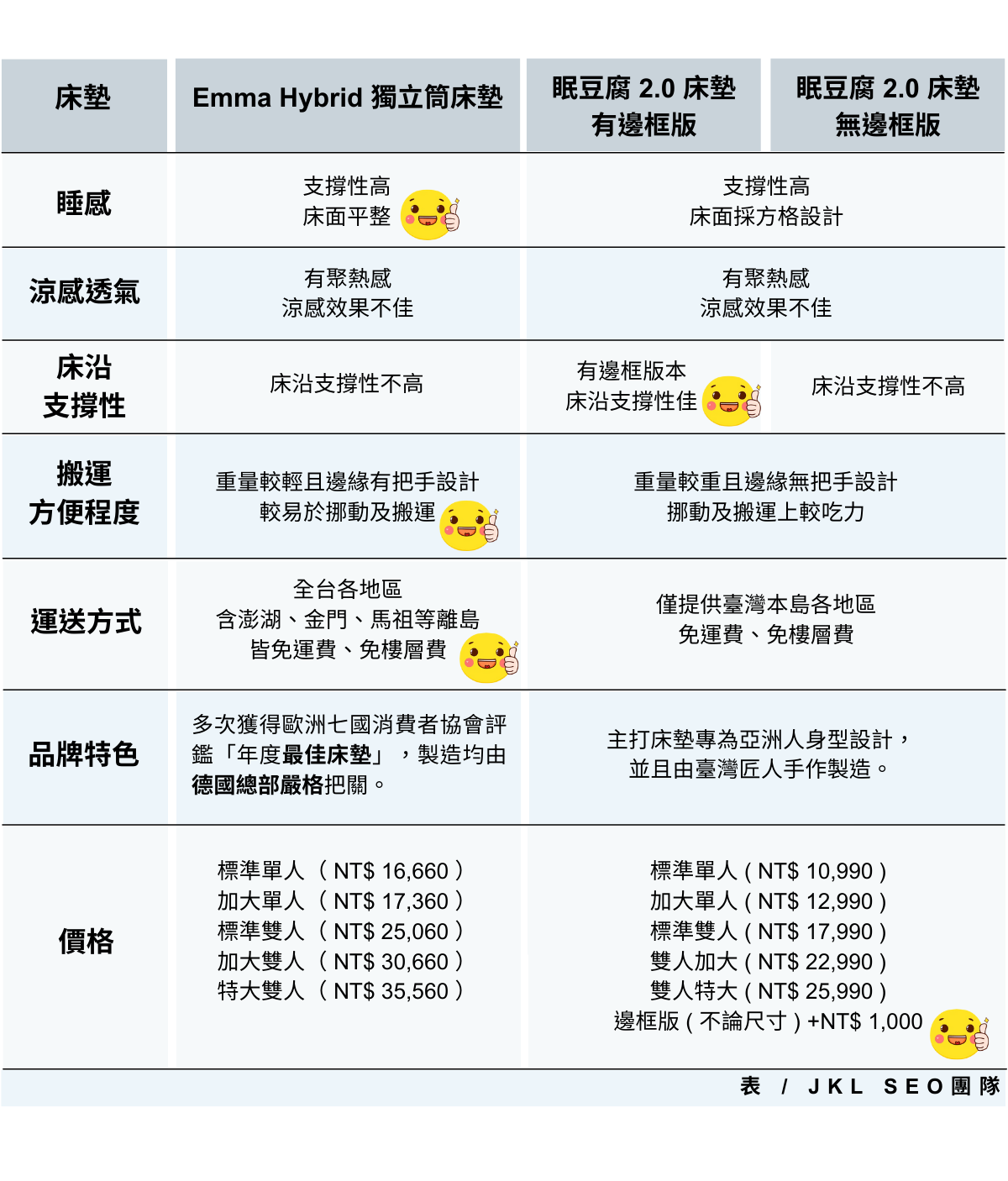 本團隊在經過實際試躺之後,針對這兩款床墊進行各種層面的比較與統整: