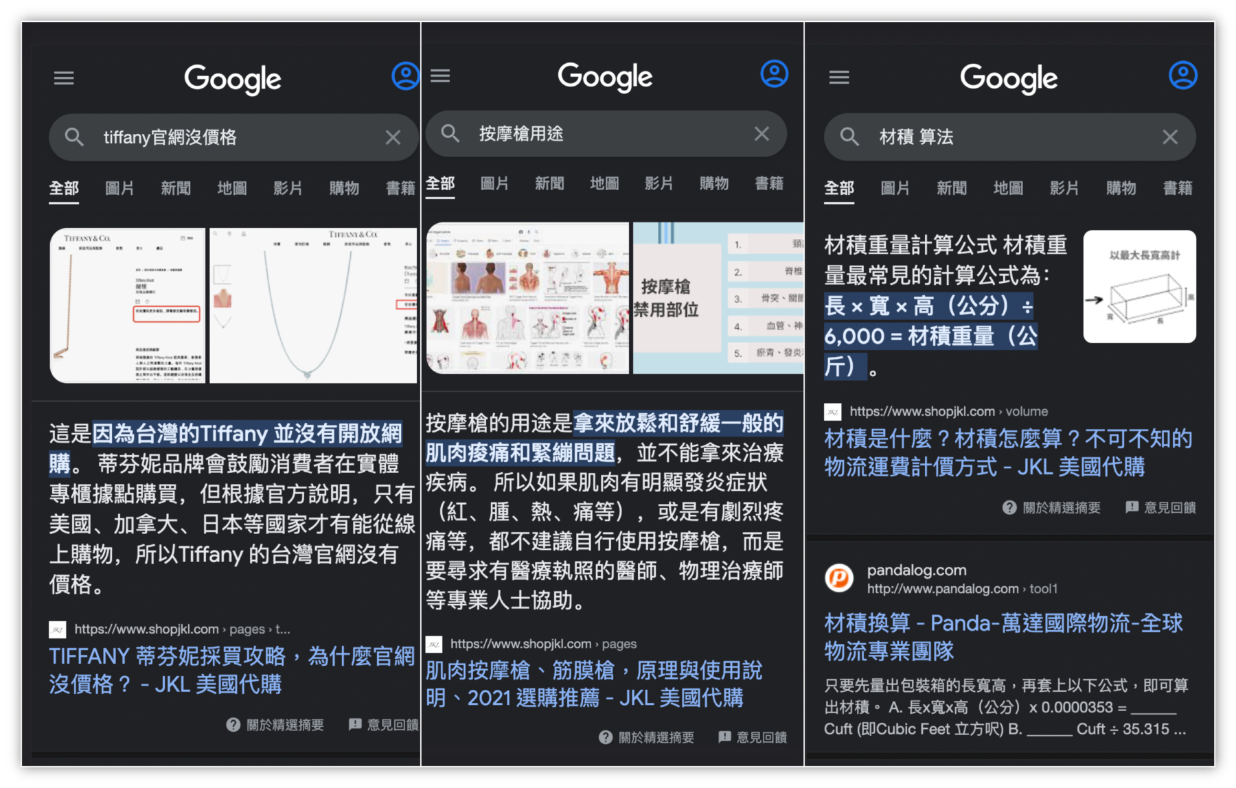 也有 SEO 專家研究出專門設計給影片、社群輪播、產品購物形式的各種精選版位,它們的共通點都是「幫助讀者更輕鬆找到想看的資訊」。