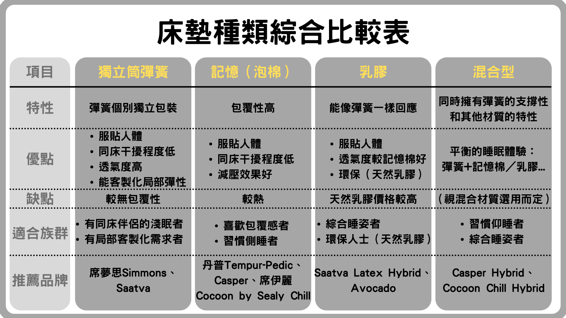 每個種類的床墊都有各自的優缺點,能滿足個人或其他特殊需求的床墊就是最適合的床墊。因此沒有所謂「最好的」床墊,只有「最適合」自己的。