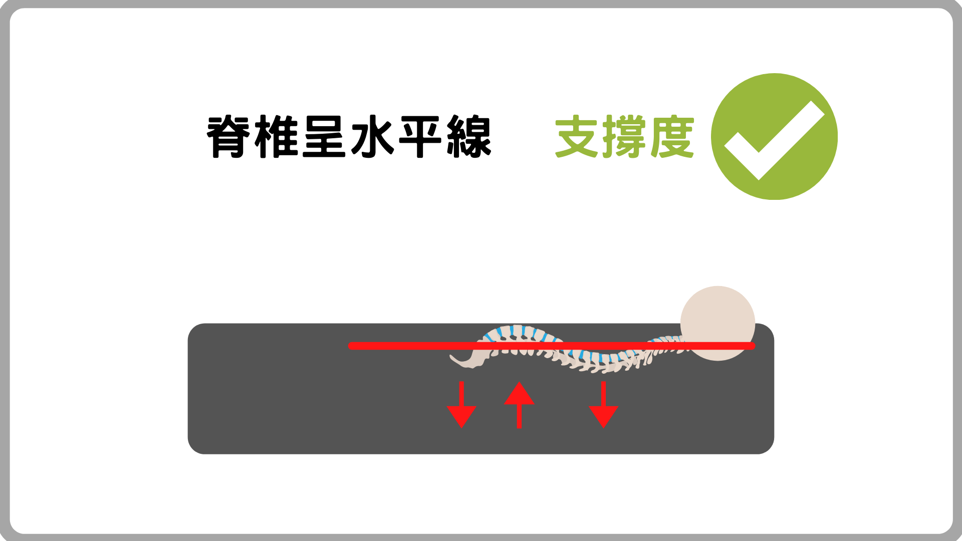 能讓脊椎平衡點呈水平線,例如仰睡、趴睡時曲線越接近自然的 S 型,或者側睡時脊椎呈一直線,代表床墊的支撐度越好,而且任何軟硬度的床墊都可能做到有好的支撐性,並非一定要是偏硬的床墊。