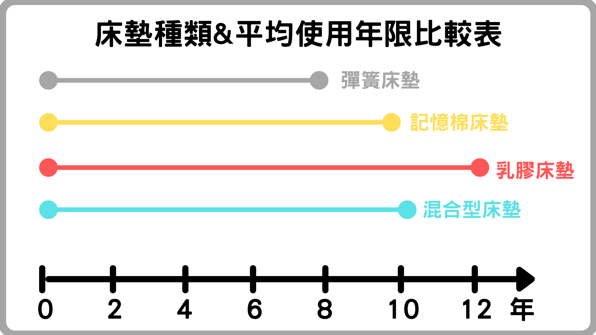 各床墊種類平均使用年限請參考下表,但實際年限仍依個人使用狀況而定。