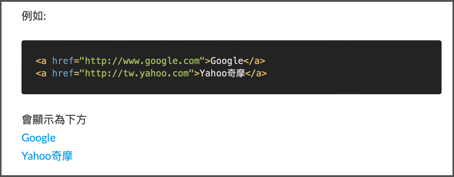 1. 連結標籤:在 HTML 編碼上,連結是用 <a> 語法來表示。