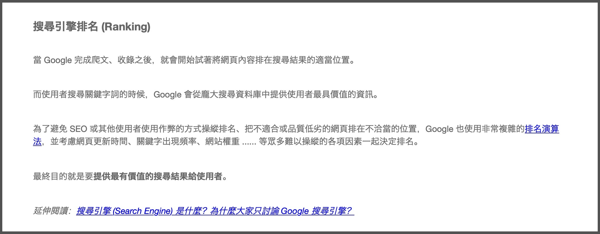 如果想讓網頁出現在 Google 的搜尋引擎結果頁面上,便需要經過爬文、收錄、排名的三個步驟。
