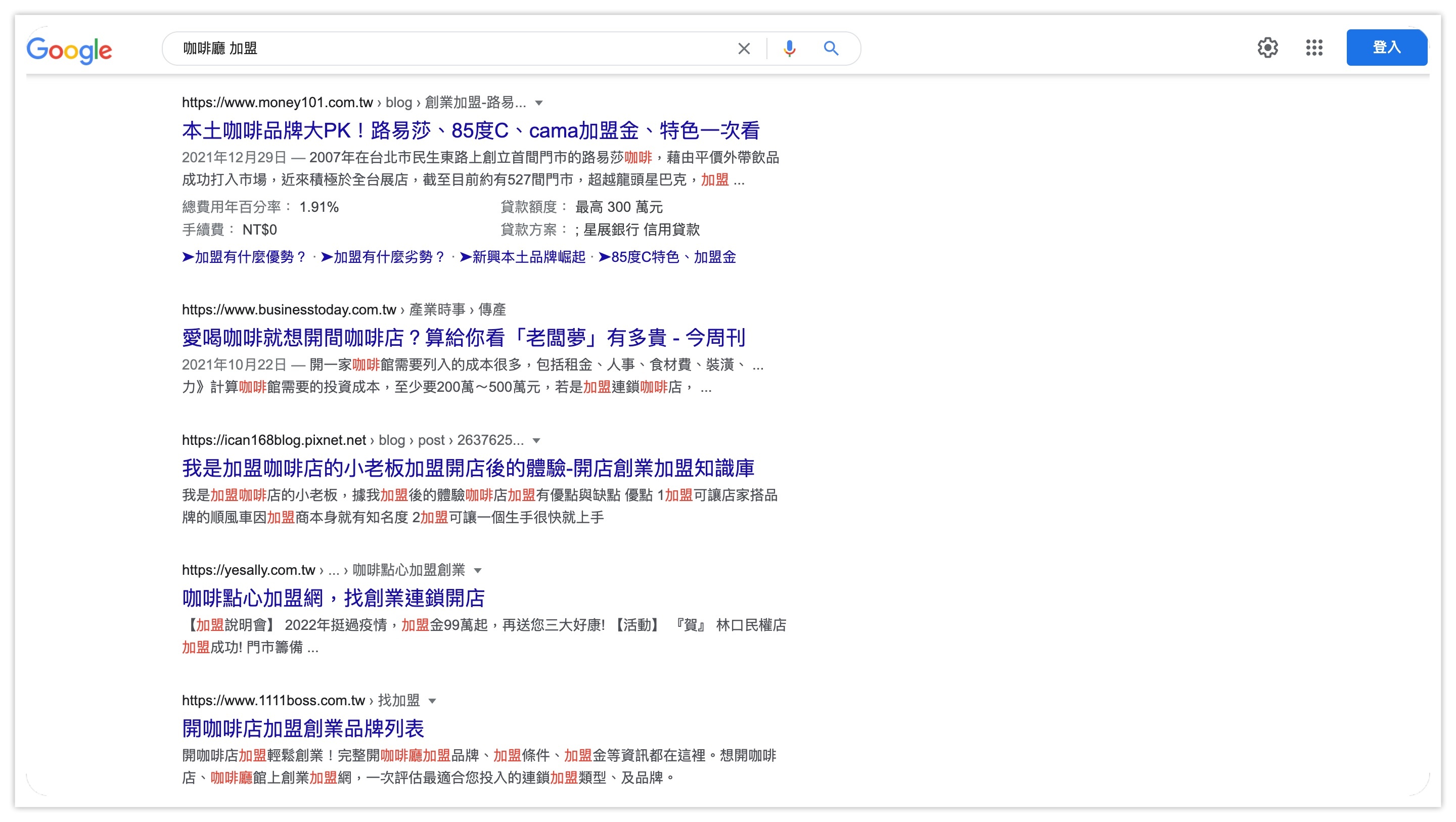 這表示:使用者搜尋這個字詞的意圖,很可能只是想找咖啡廳光顧,而不是要看加盟的資訊。
