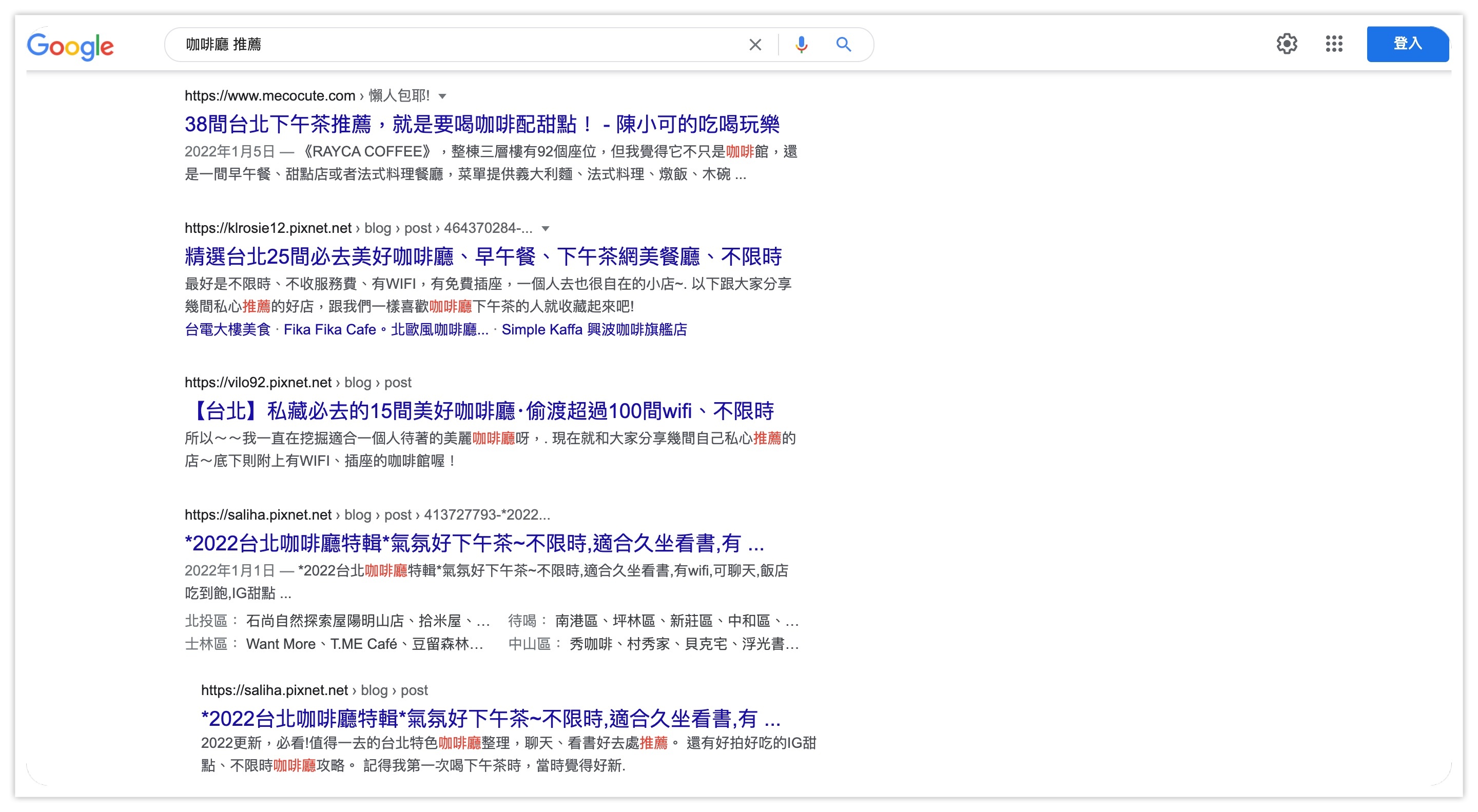 接著嘗試搜尋「咖啡廳 推薦」,第一頁的結果卻都是哪邊咖啡廳好吃或漂亮的部落格文章。