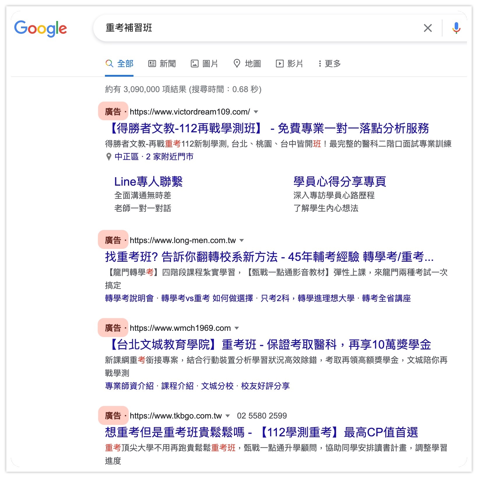 例如,搜尋「重考補習班」,最上面的結果全都是廣告,表示很多人願意「出錢」被更多人看到,這競爭可能就很激烈。
