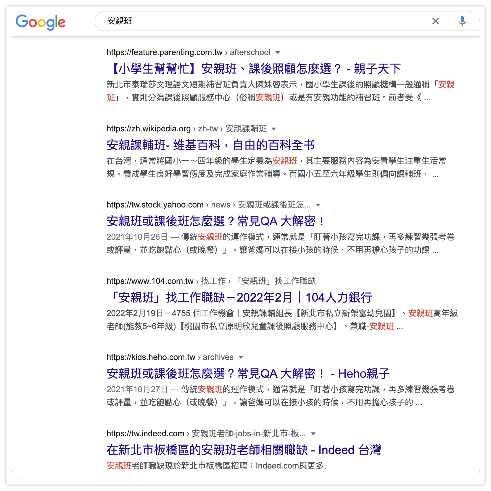 另一個字詞:「安親班」在同時段的搜尋結果就沒有廣告,顯示競爭程度較低。