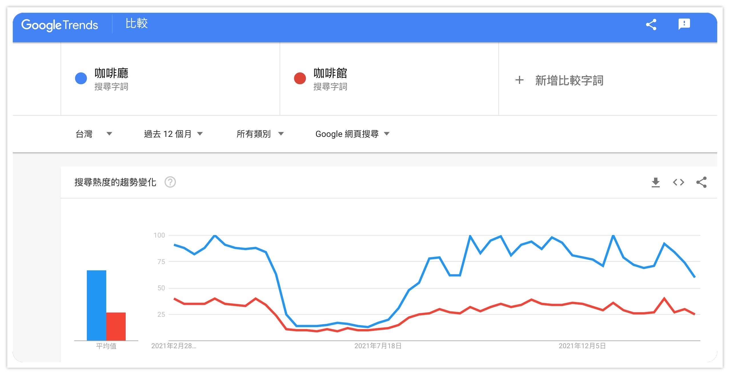 例如,「咖啡廳」與「咖啡館」雖然意思相同,但由下圖可見,過去一年來「咖啡廳」的搜尋量遠高於「咖啡館」。