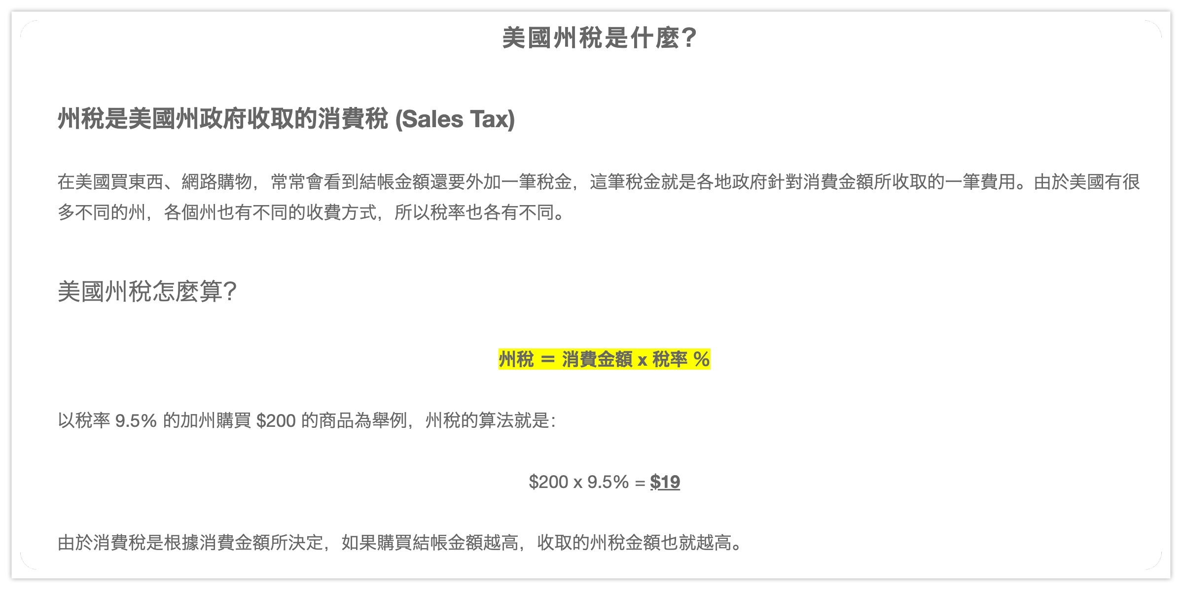我們在介紹美國州稅的文章中,就開宗明義的介紹「美國州稅是什麼?」、「美國州稅怎麼算?」等。