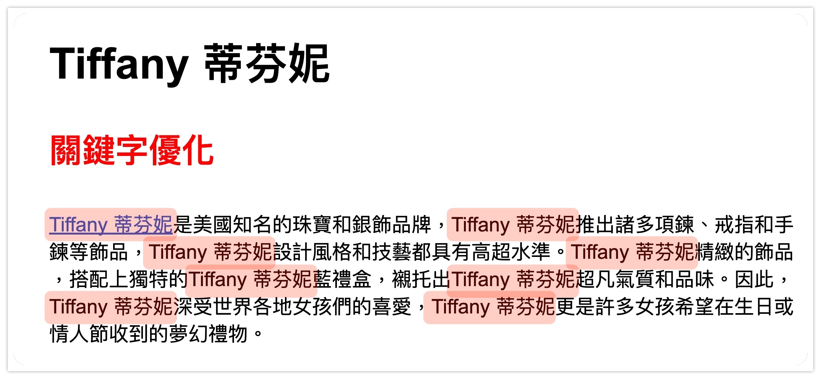 以下是硬塞關鍵字的例子,文章中一直重複出現關鍵字「Tiffany 蒂芬妮」,會讓讀者覺得讀起來很不自然,像是在不斷重複廢話一樣。