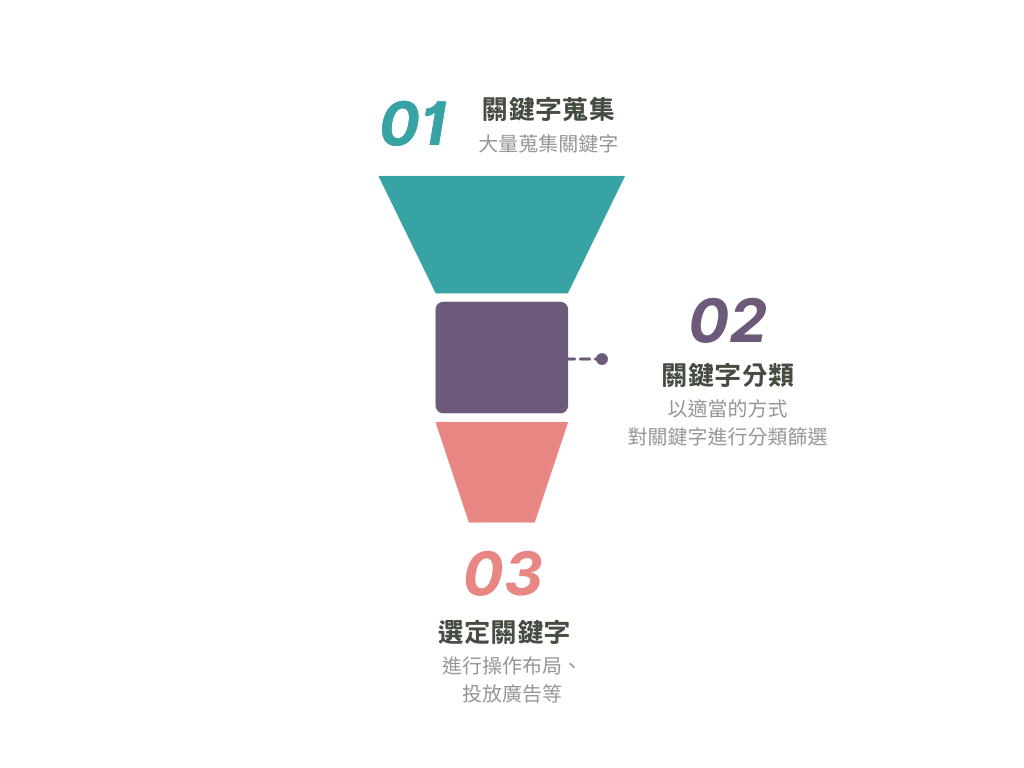 在蒐集相關的關鍵字之後,要如何在龐大的關鍵字資料庫中,選擇適合自己且又可以帶來效益的關鍵字呢?這時候就需要進行關鍵字分類。將各種關鍵字進行分門別類並且初步篩選,最後挑選出最適合用來布局或是投放廣告的關鍵字。