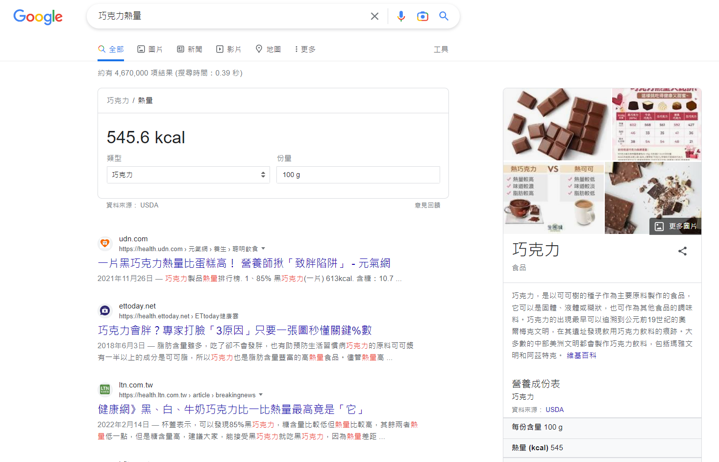 圖:搜尋「巧克力熱量」,答案已直接顯示在搜尋結果頁面 / Google 搜尋結果