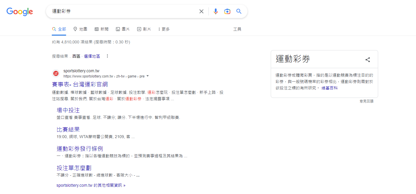 圖:搜尋「運動彩券」的使用者,通常是為了尋找「台灣運彩」的官方網站 / Google 搜尋結果