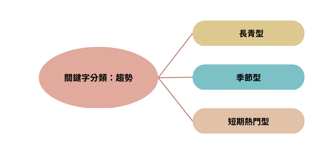 這個分類方式主要依據的是關鍵字的長期變化趨勢,依據其變動模式可分為以下三類: