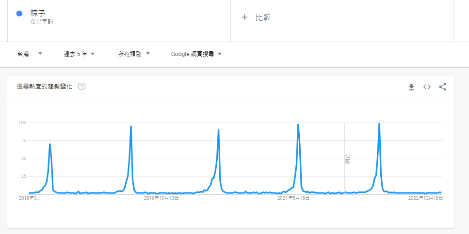 圖:季節型關鍵字-「粽子」的趨勢變化 / Google Trends 搜尋趨勢結果