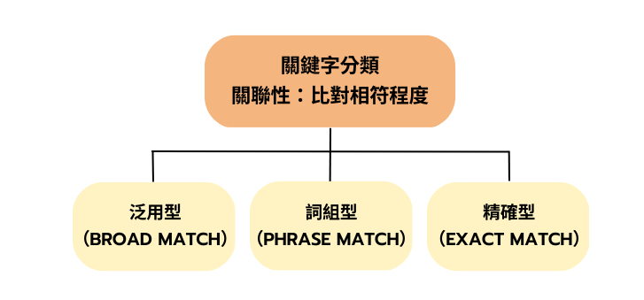 範圍最大,只要與主題相關的關鍵字、甚至不需要包含關鍵字,只要有廣泛關聯的也算。雖然因為範圍較為廣泛可能帶來流量,但很有可能搜尋這樣關鍵字的使用者並不是操作關鍵字的目標族群。
