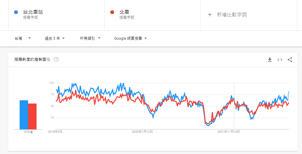 圖:「台北車站」與其節縮詞「北車」擁有幾乎不相上下的搜尋量 / Google Trends 搜尋趨勢結果