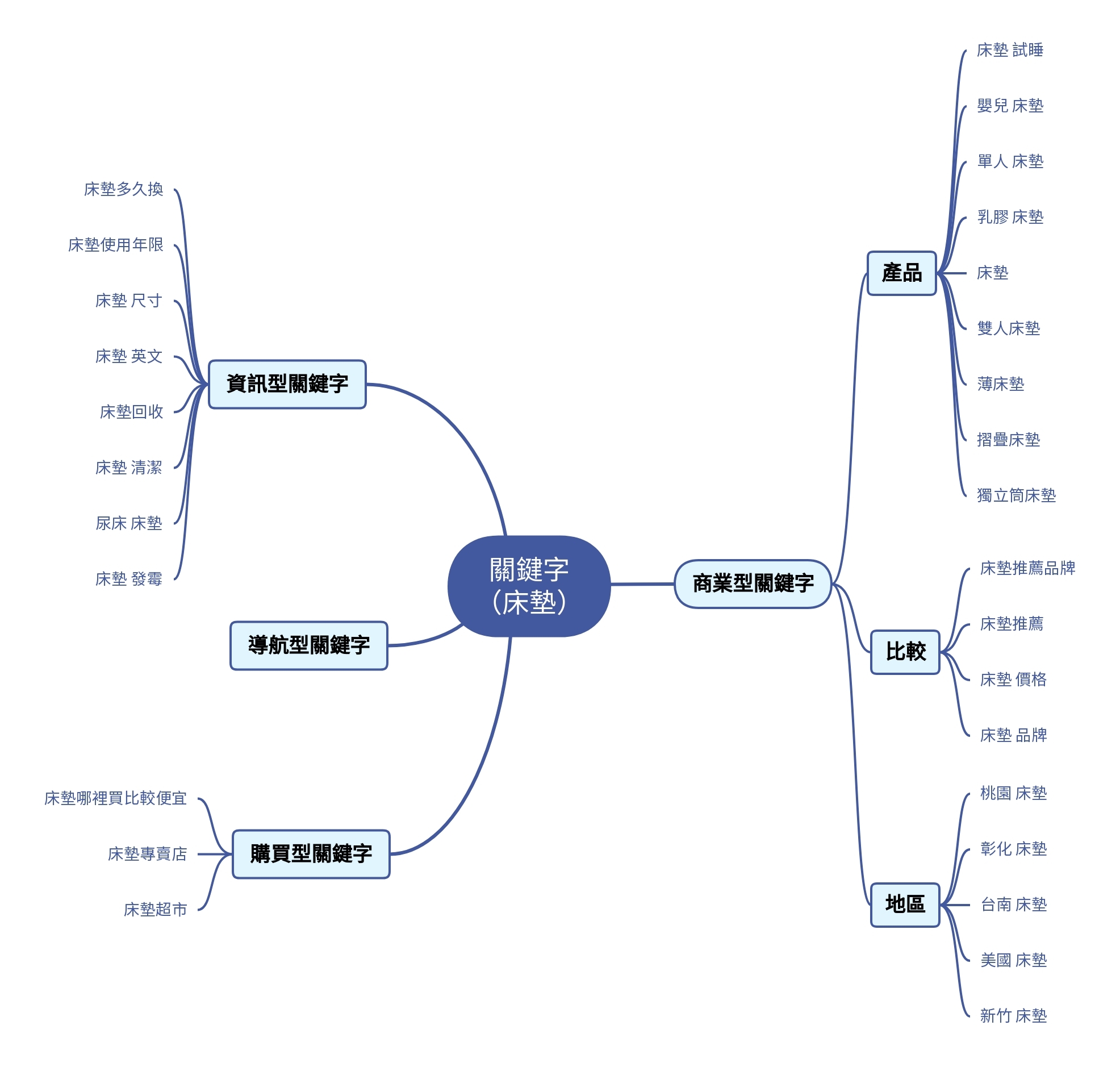 假設今天業主經營一個床墊品牌,想要針對「床墊」進行關鍵字蒐集後分類,操作示範如下: