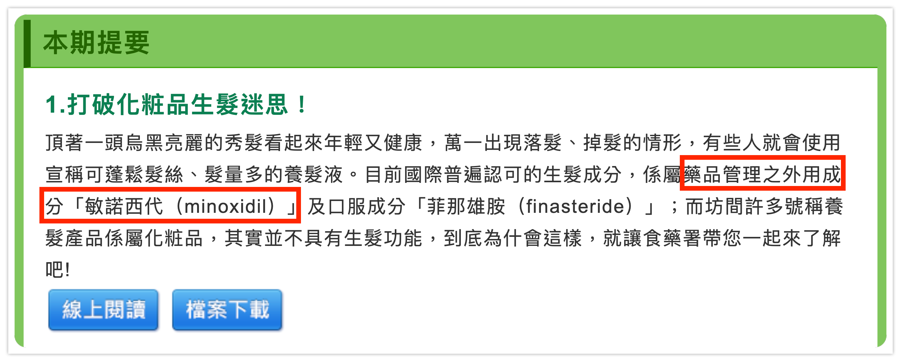 落健的主要成分 Minoxidil(敏諾西代),在衛福部被列管為藥品,圖片來源:衛福部食藥署