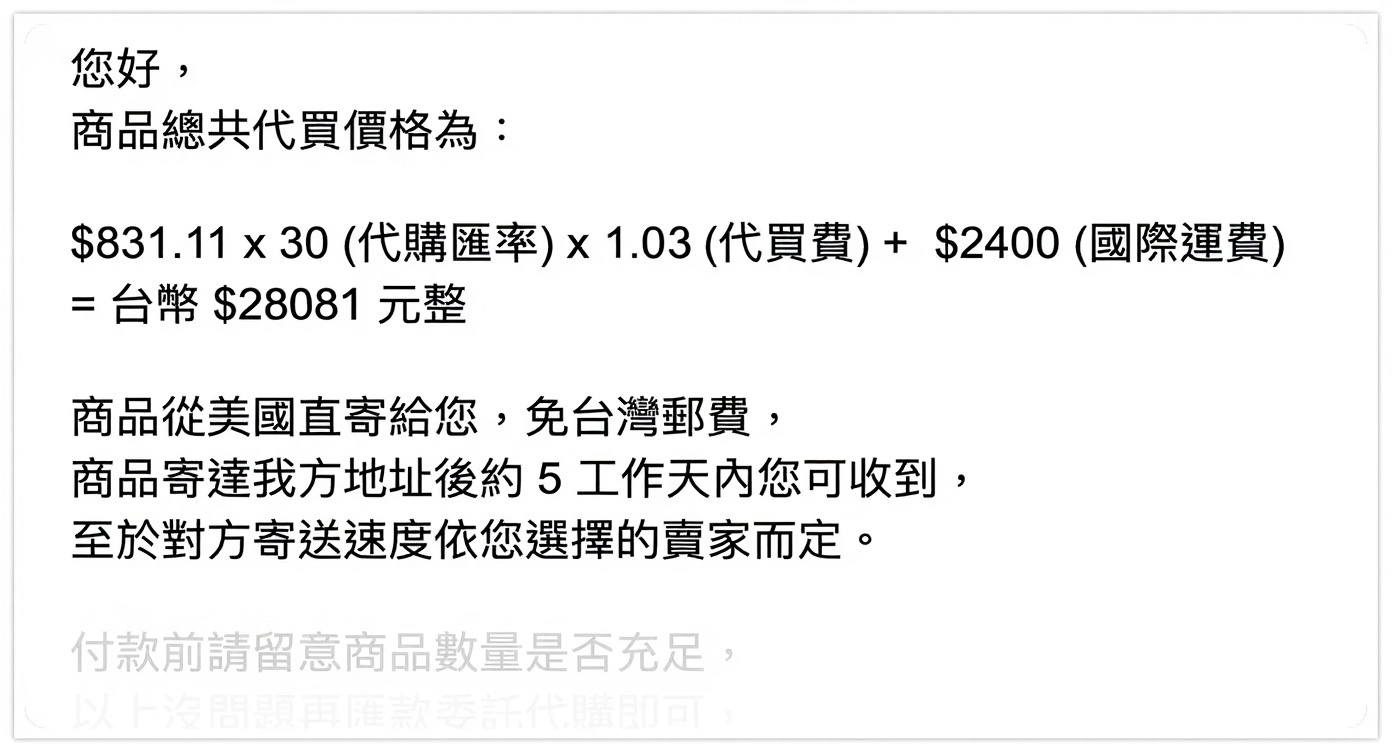 A:除非另有註明,否則所有代購報價皆不含關稅,JKL 會依自身經驗將查驗發生機率及成本降到最低