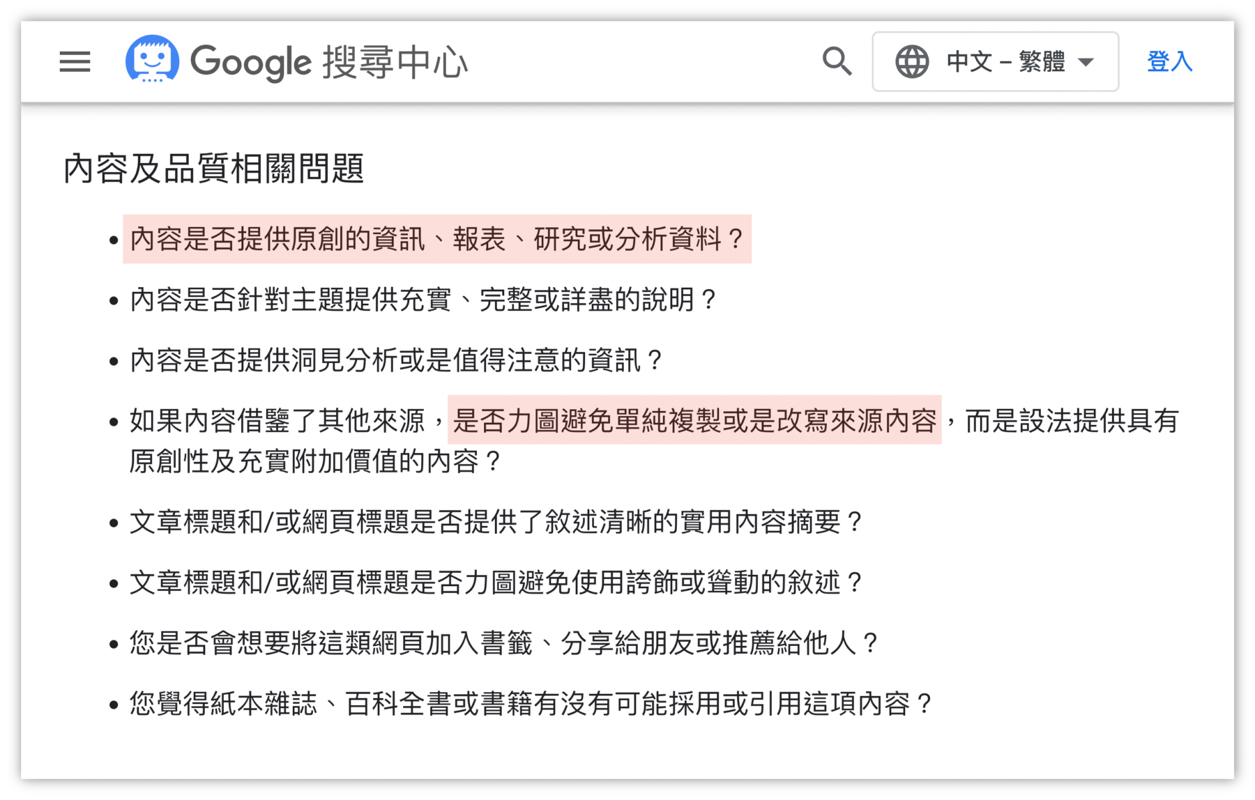 此外, Google 也十分注重文章的原創性,在「實用內容更新」中提出:「文章內容是否清楚呈現第一手專業知識及具有深度的知識?」,會影響這篇文章的排名訊號。