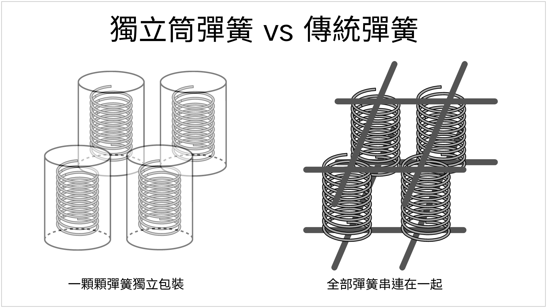 一般傳統連結式彈簧則彼此串連牽制,比如背部重量壓在支撐背部的彈簧時,會牽動到其他彈簧,因此可能導致腰部懸空,可以說是牽一髮而動全身。