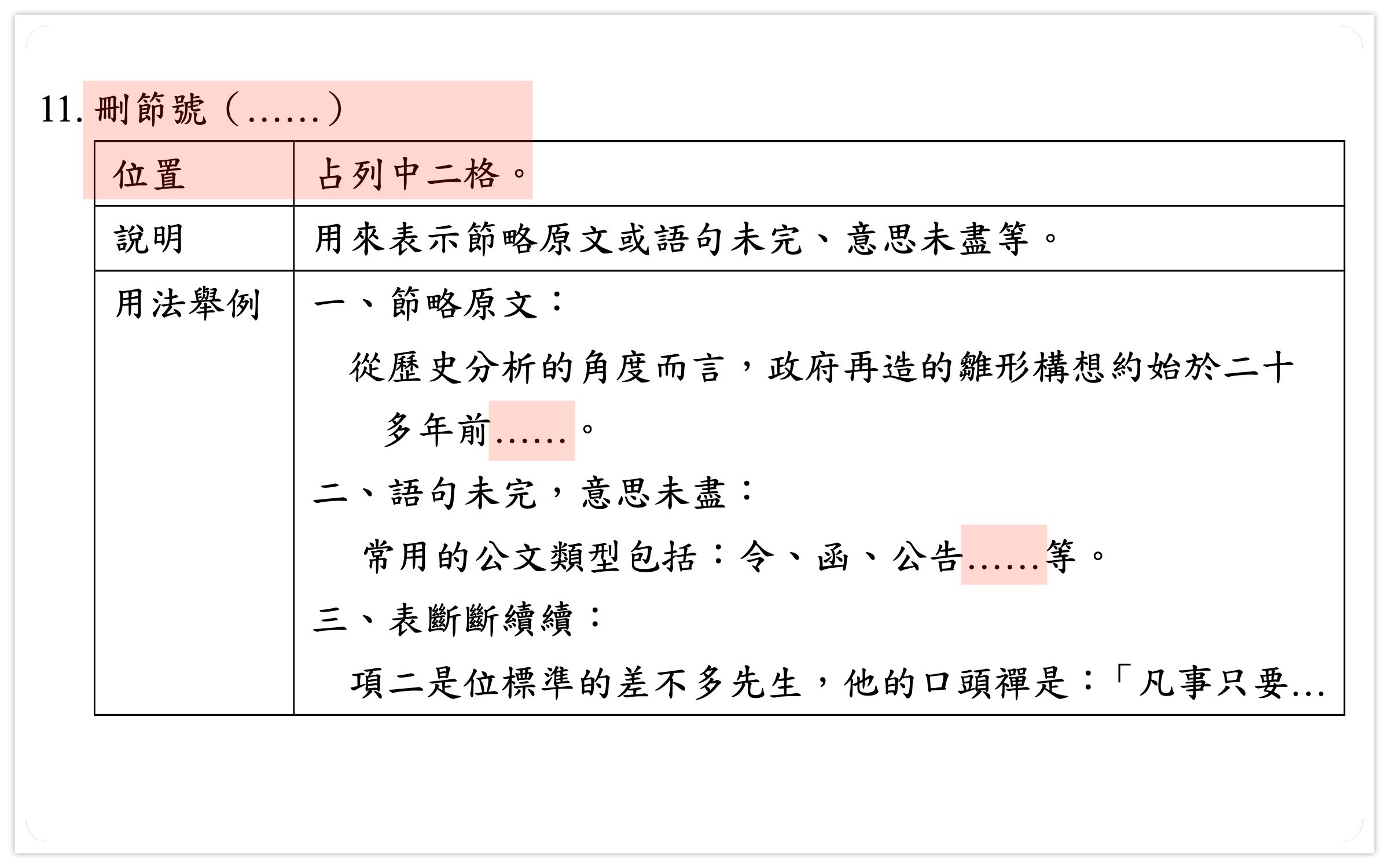 | 刪節號 | ⋯⋯ | ... | 教育部標準用法:省略原文、省略語句、表示斷續。 | 隨意使用各種數量的圓點、誤使用句號當作刪節號使用。 | 上網常用的符號還包含:斜線、方頭括號、顏文字 ...... 等等。 |