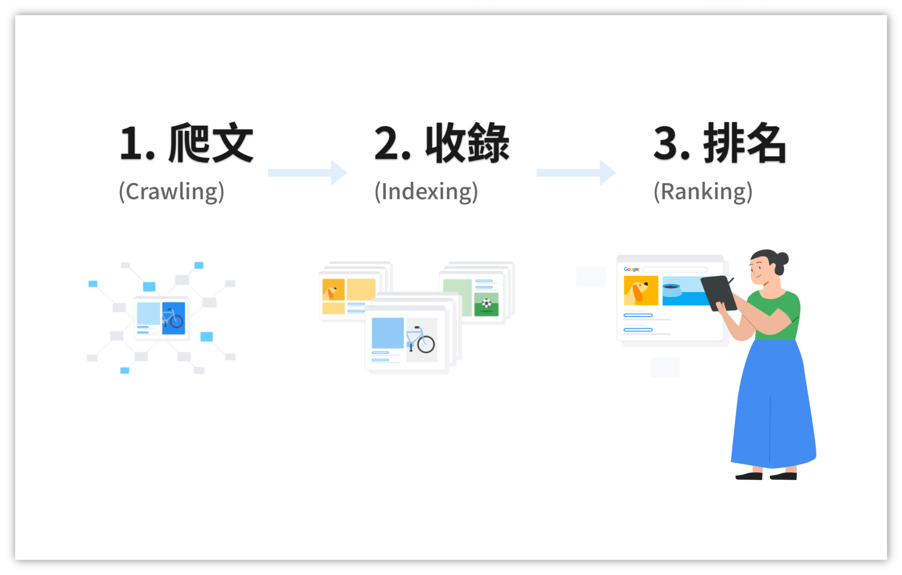 爬文、排名、收錄,這三個主要的流程就是搜尋引擎最核心的運作機制,Google 也就是透過這樣的方式將最有幫助的資料呈現給使用者。