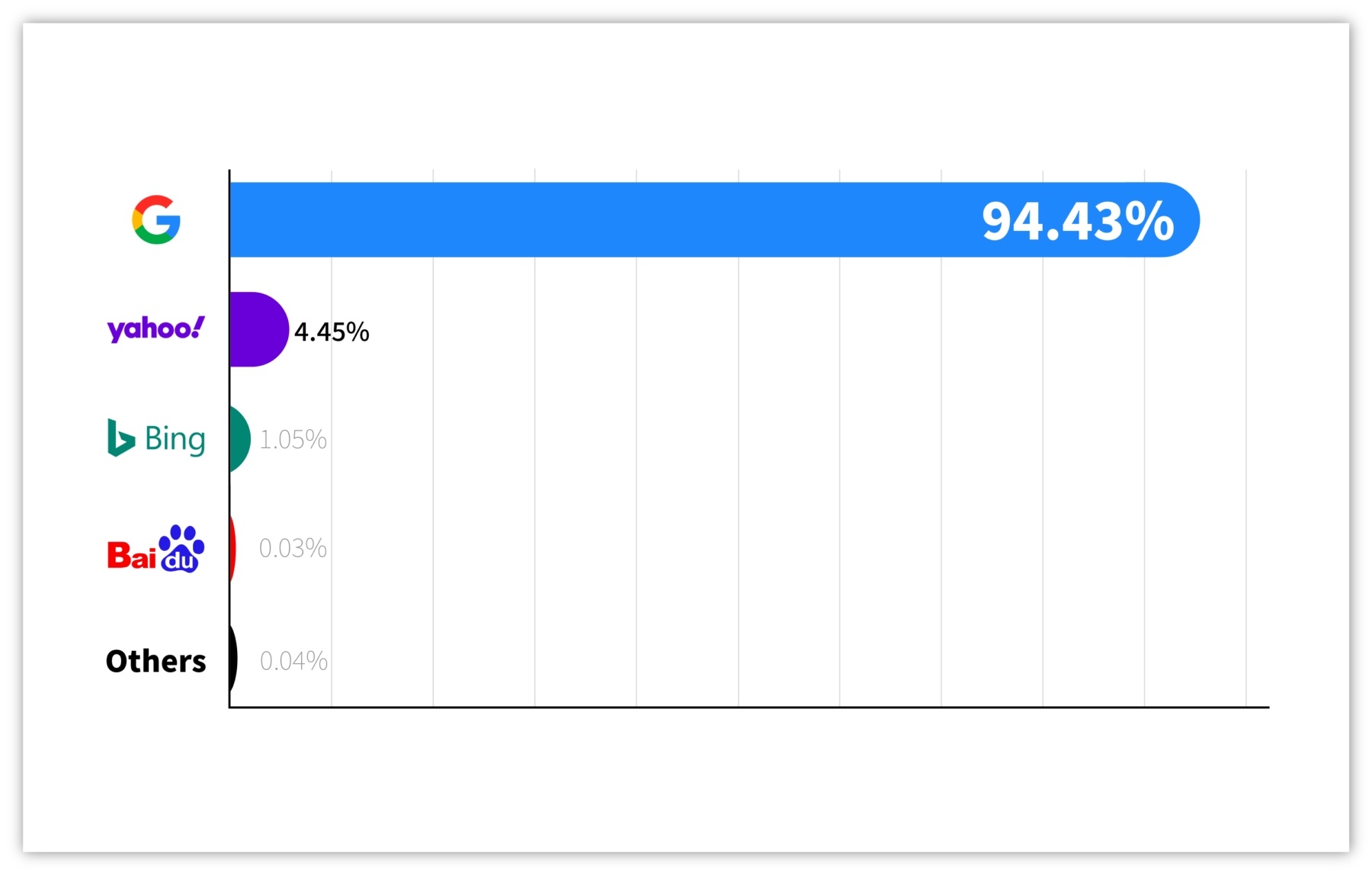 Google 是全世界最大的搜尋引擎,它佔據了 94.43% 的市場份額。