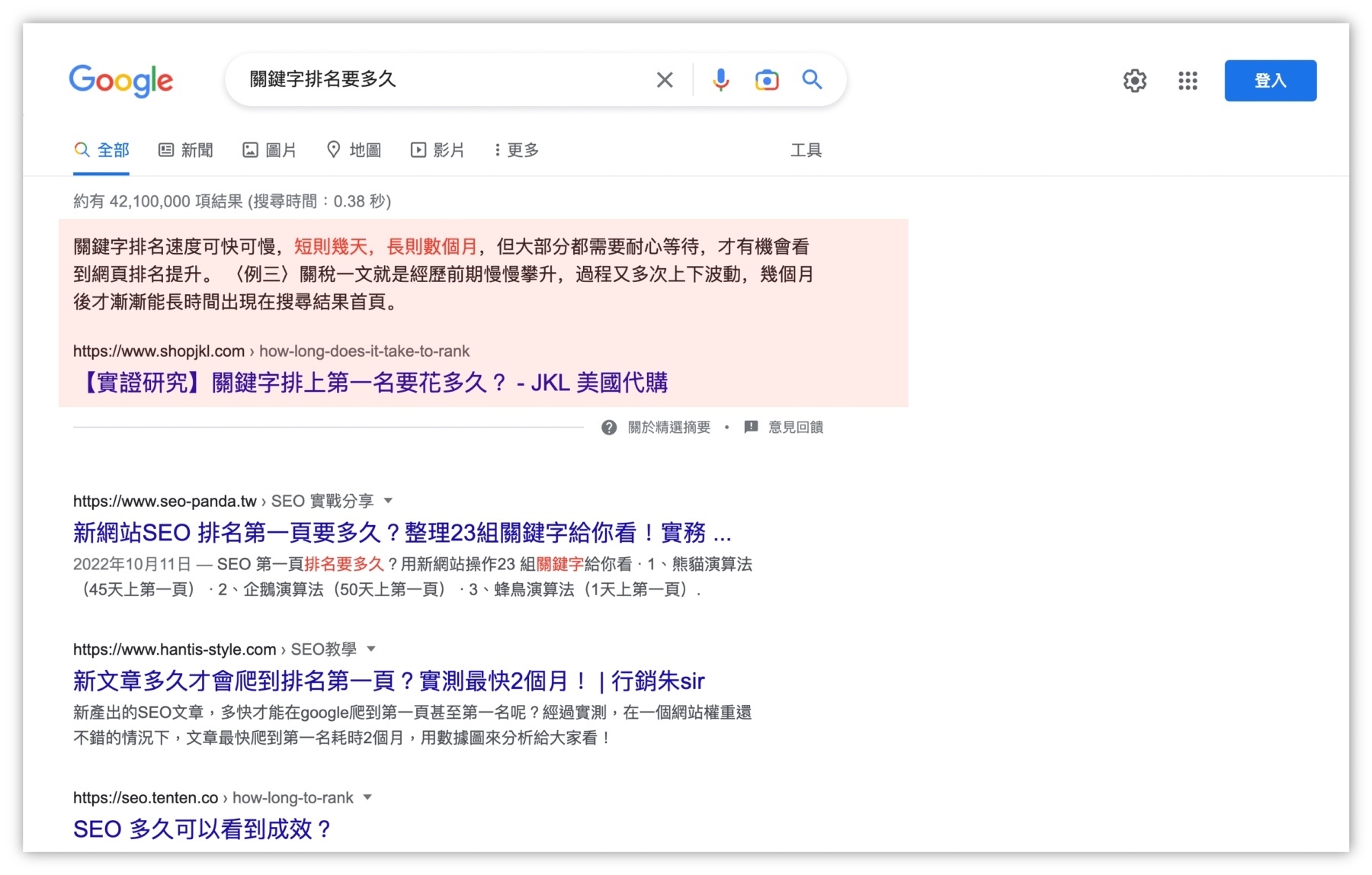 當你搜尋「關鍵字排名要多久」,Google 就會給答案了:短的話要幾天、長的可能要等幾個月,但大部分的情況下都需要耐心等待。