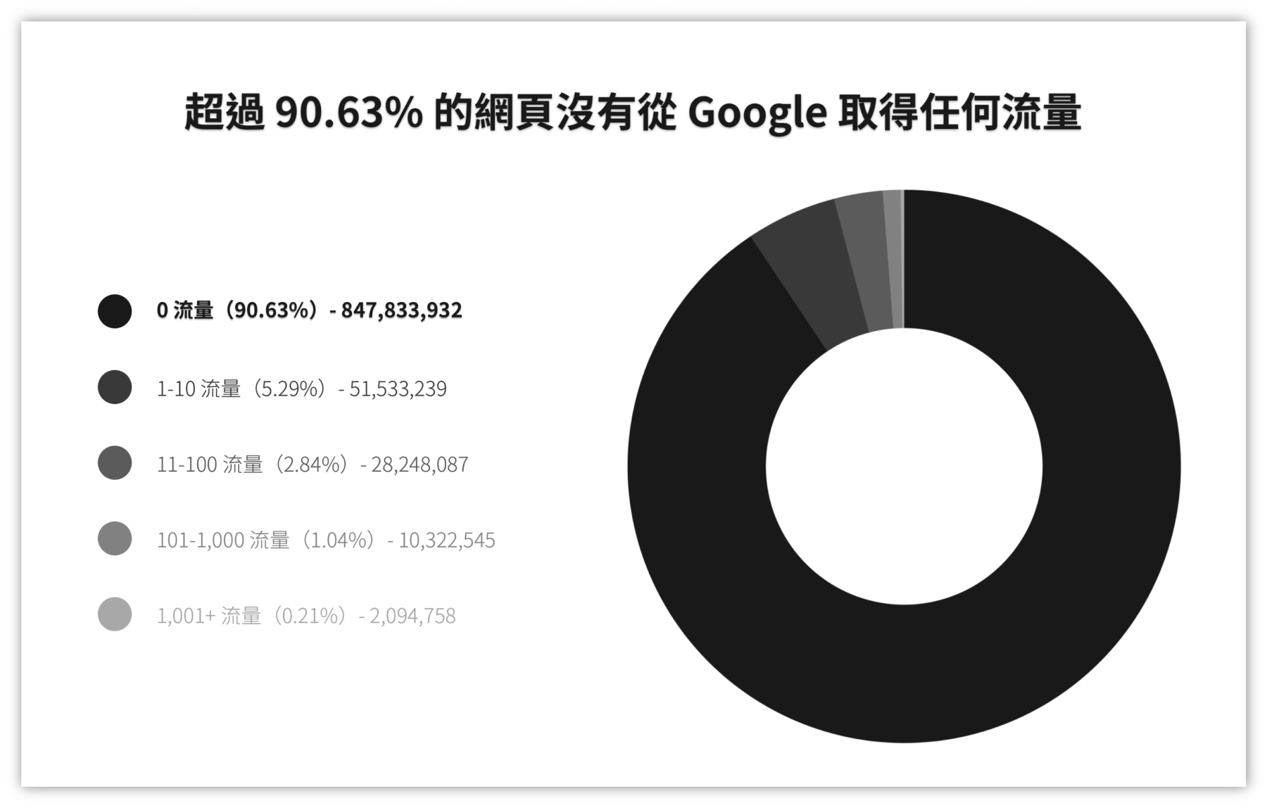根據知名的 SEO 權威《ahrefs》統計,整個網路上,有超過 90% 的網頁沒有從 Google 得到任何流量。