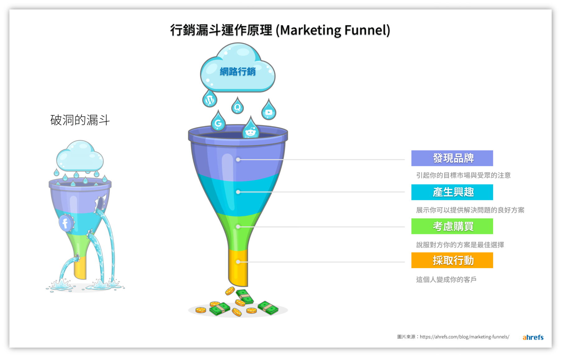 這就是「行銷漏斗」的概念,把採取行動的流程,用漏斗的形狀來表達。