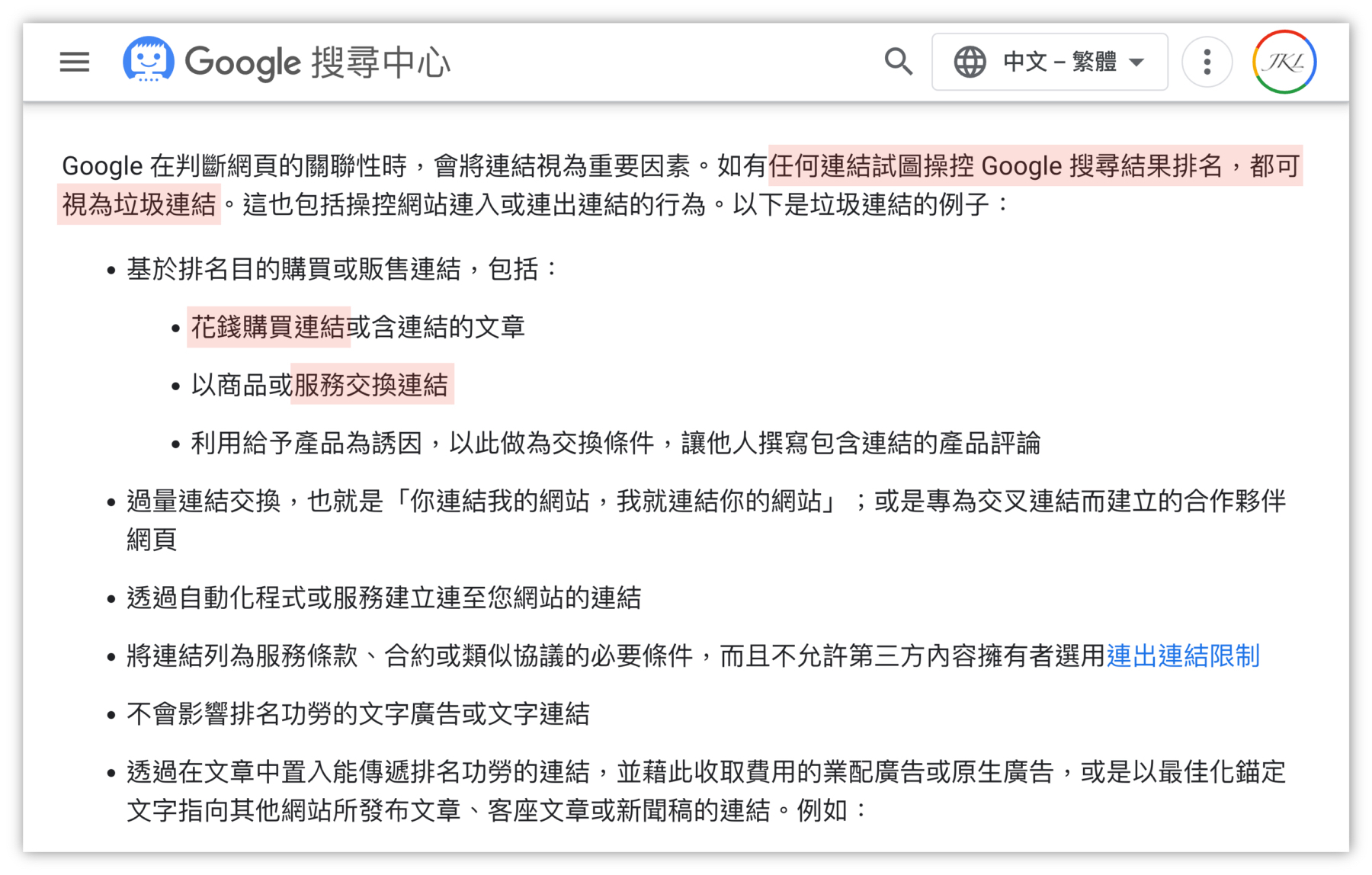但 Google 當然不希望搜尋品質被這樣影響、破壞,所以官方對反向連結的「取得」有嚴苛的限制。簡單來說:任何操縱連結影響排名的行為,都可以被視為是違反規範的垃圾連結。