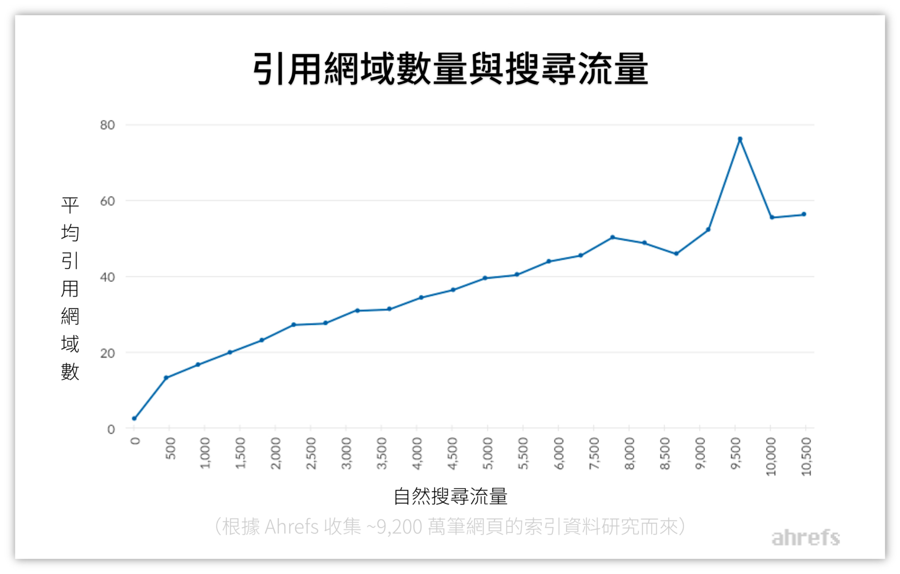 Ahref 針對 9 億 2,000 萬個頁面做了分析研究,結果發現:頁面得到來自不同網站的連結數量越多,那從 Google 獲得的自然搜尋流量也就越高。連結「網站數」和 SEO 表現,兩者之間存在很強的相關性。