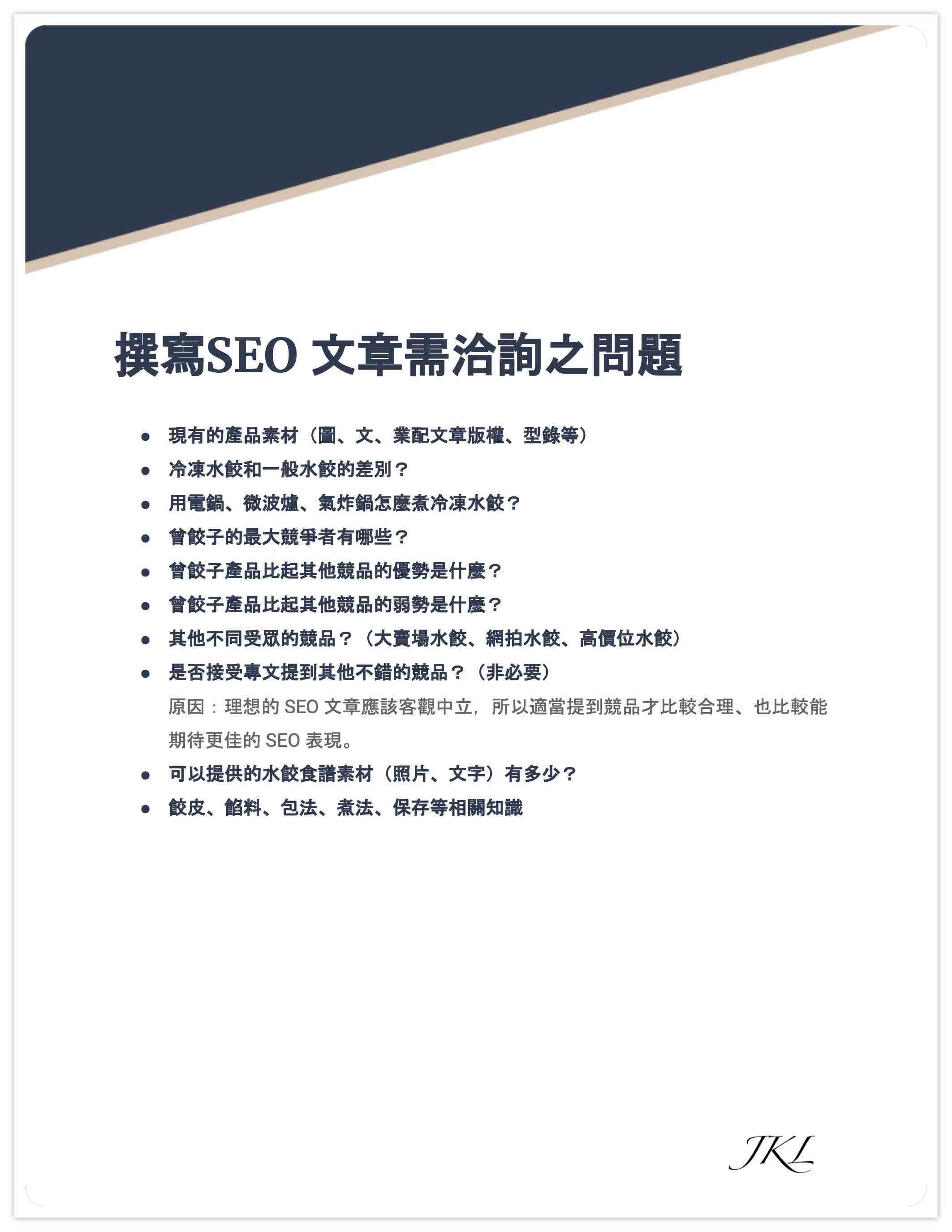 但 JKL SEO 除了基本的網站檢測、針對現有網站提供優化方向建議以外,也有提供內容行銷專文撰寫(如:「冷凍水餃推薦」SEO專文),採行新舊內容雙管齊下、同時優化的策略。