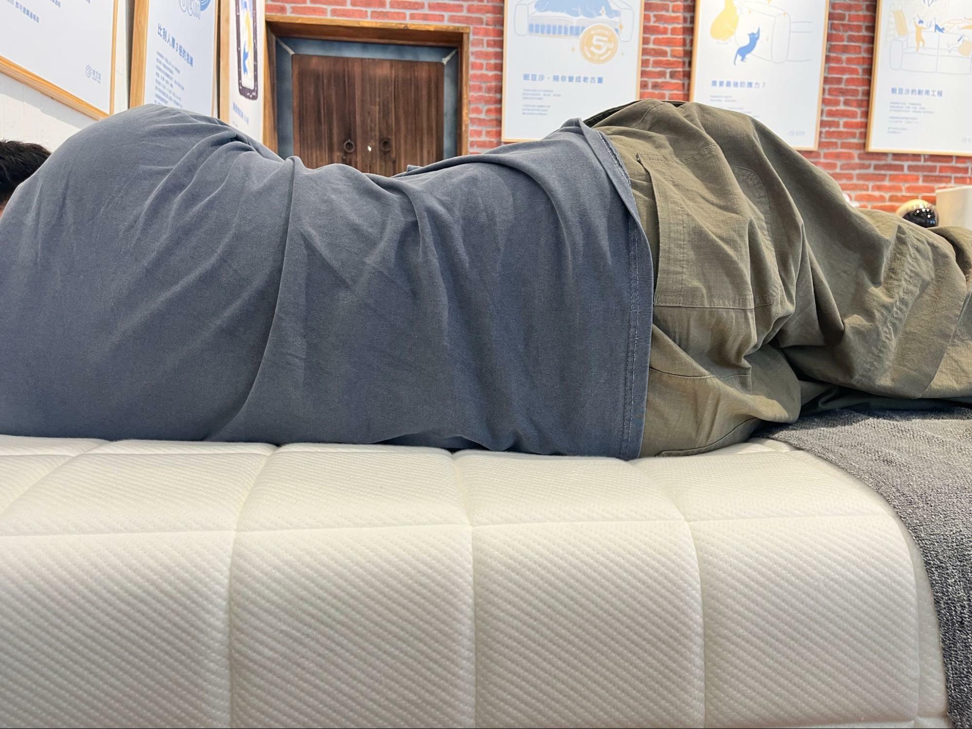 在眠豆腐上趴睡時,身體是貼合在床墊上,很有包覆感,同時又有支撐性,有一種減壓的體感。不過,頭頸部的服貼度,應該和搭配的枕頭有一些關係。