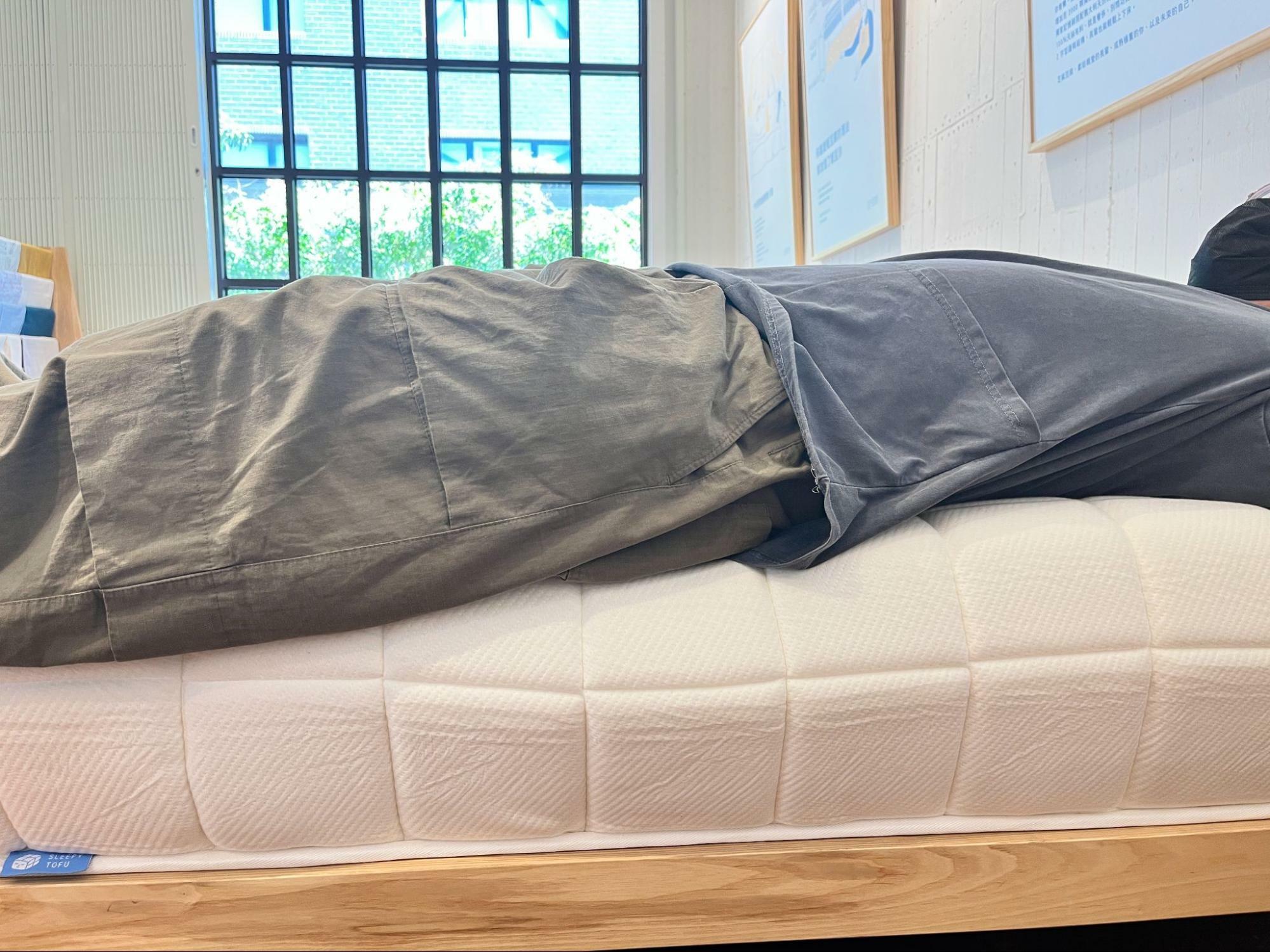 這次試躺眠豆腐,我感覺身體是很平均的落在床墊上,沒有哪個部位特別下陷或壓迫。身體在接觸床墊時,第一個感受是柔軟,但會覺得柔軟的密度很高,因為躺下去的時候,全身會有被支撐住的感覺。