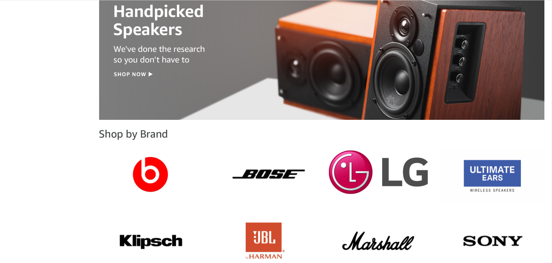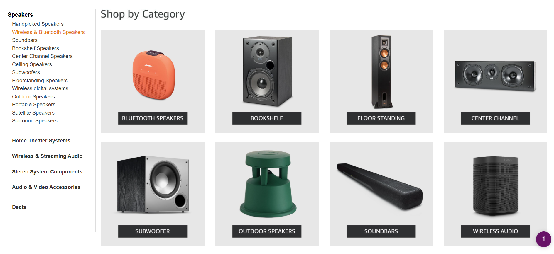 頁面上方有依照音響種類的分類:藍芽音響、落地式音響、書架式音響、長條式音響等; 頁面下方則有提供常見音響國際大廠牌的分類: