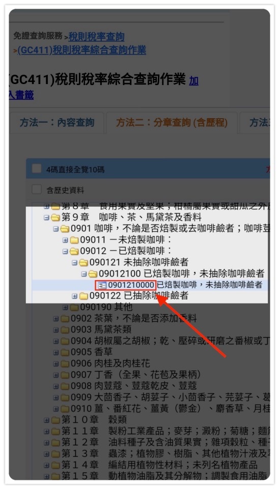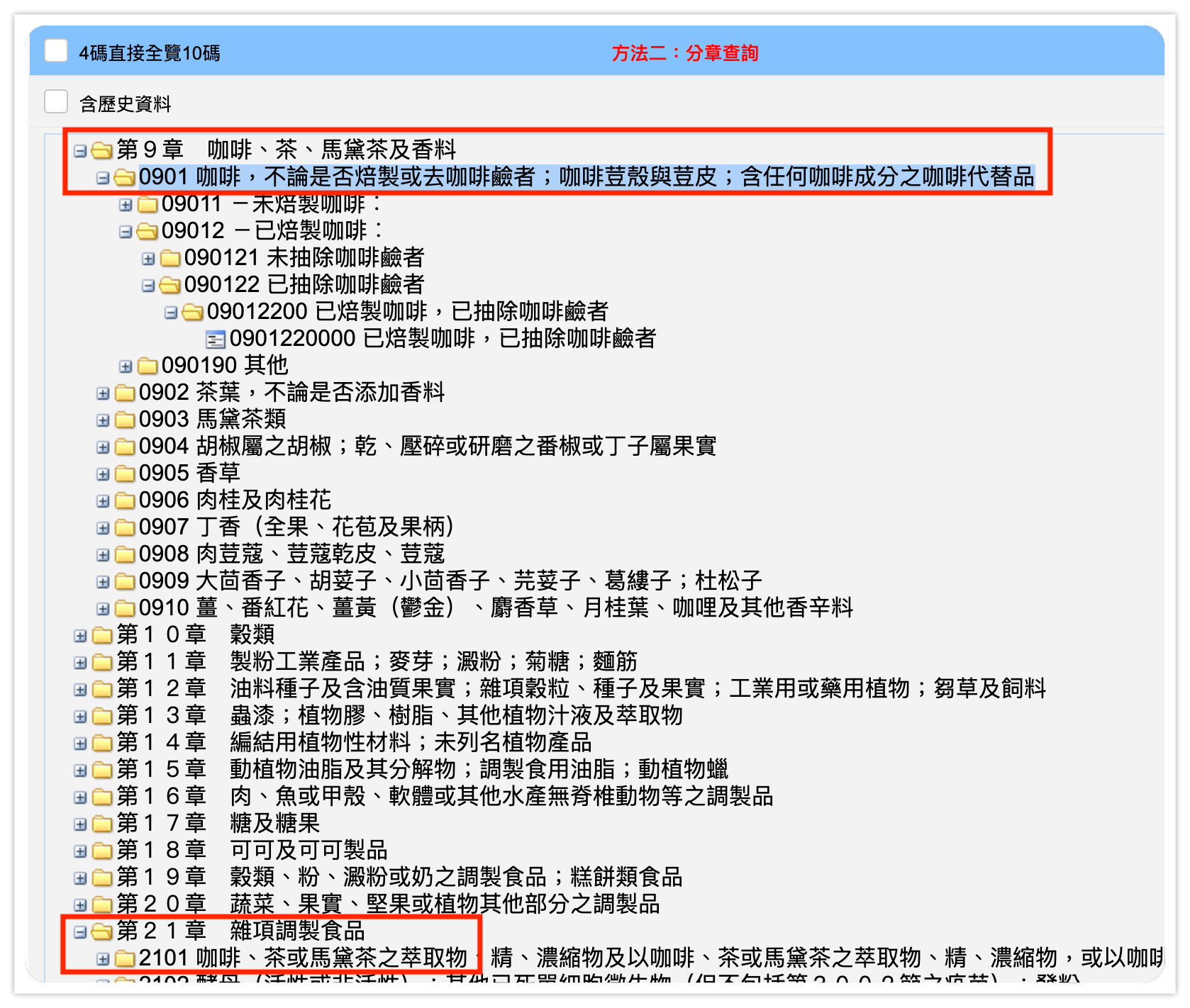 像是很普通的「咖啡」,在分章查詢中就硬是標示成「不論是否焙製或去咖啡鹼者 ......」這種相當令人相當疑惑的字詞。