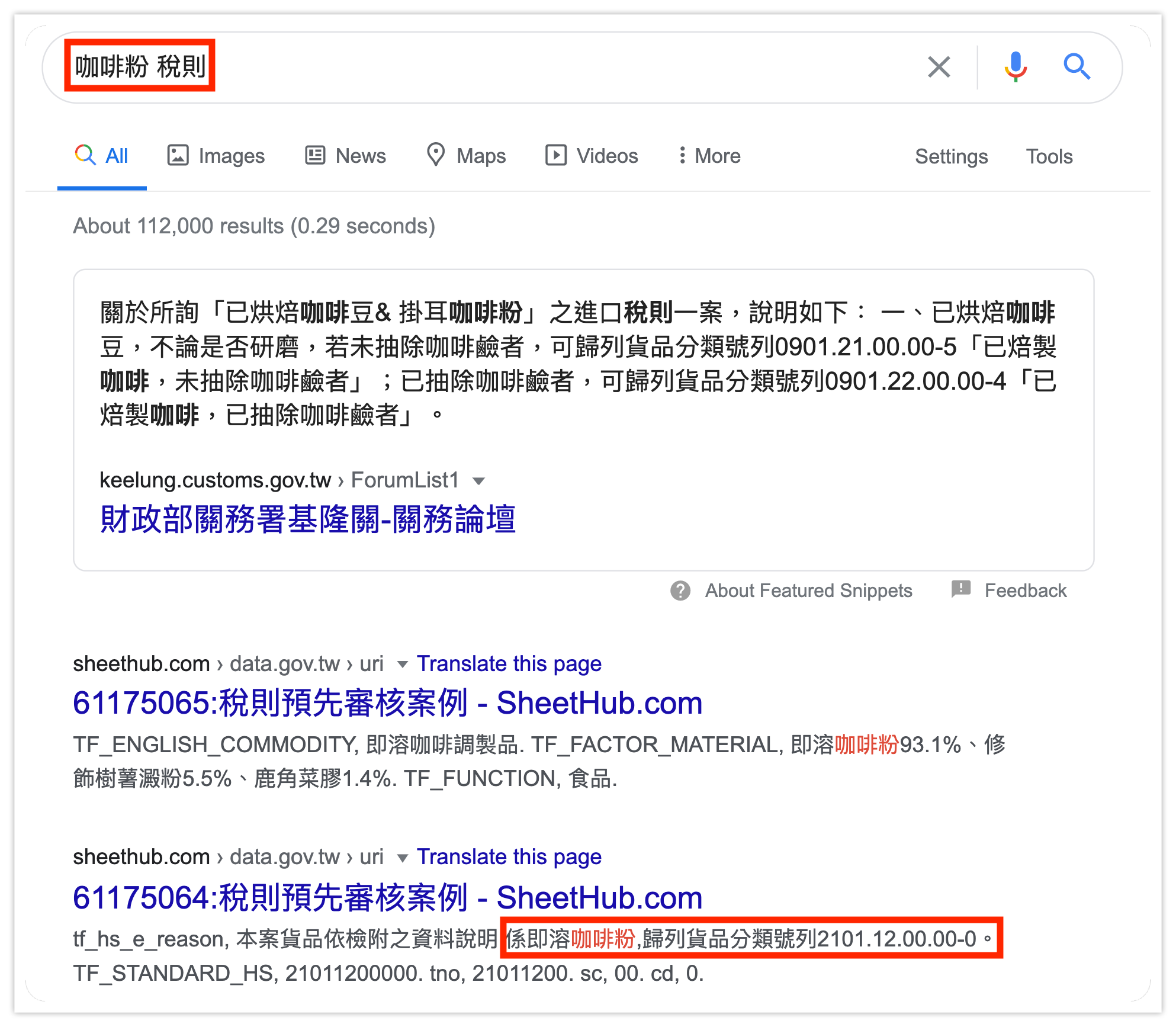 從 Google 搜尋結果,可以知道「即溶咖啡粉」在預審的紀錄中被認定為 "2101.12.00.00",這時候再從「分章查詢」21 → 2101開始查找,就能得到更明確的稅率了